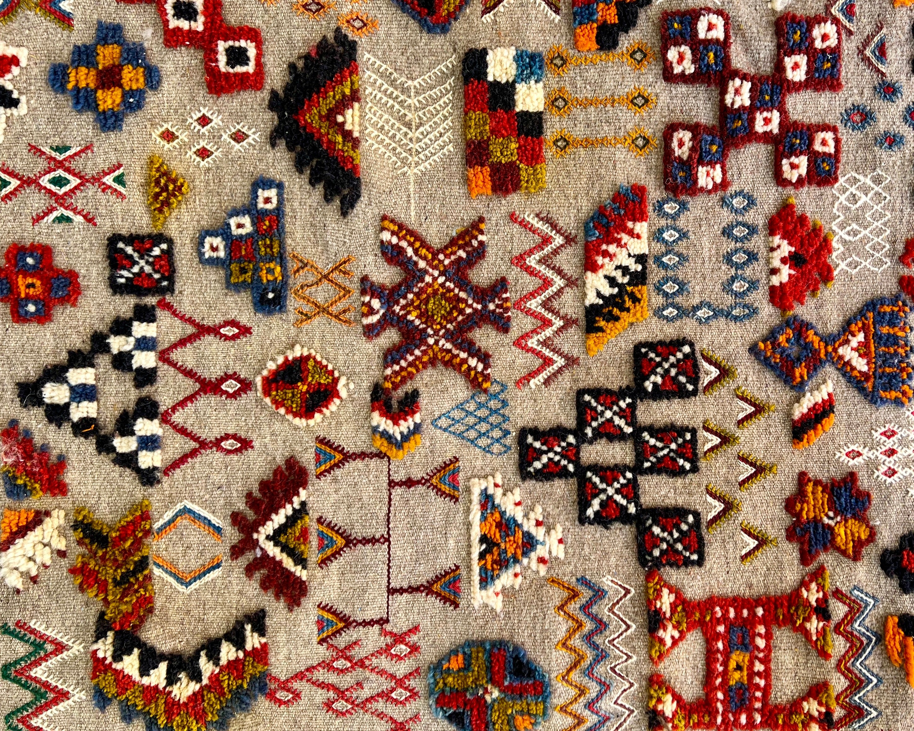 This style is thought to originate from the area in and around the Village of Tazenakht, an area rich with a weaving history. While the majority of this weave is flat, the design accents are either embroidered or have a slightly higher pile, giving this piece texture and dimension. Every design element comes entirely from the artisan’s imagination. The design elements within this technique tend to depict an array of symbolism in the Amazigh culture.