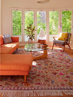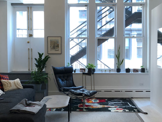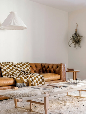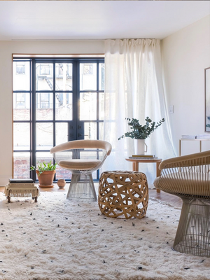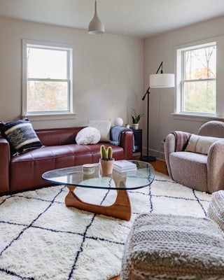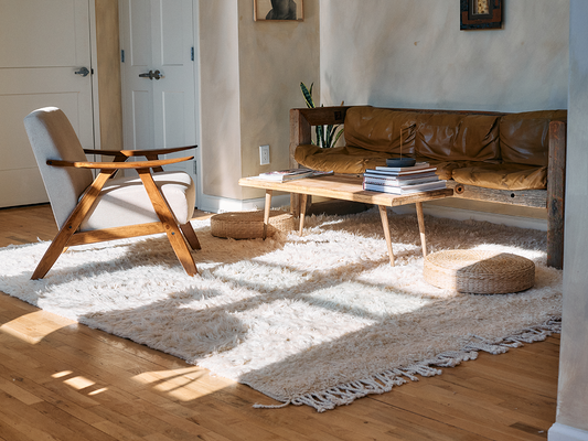 Add warmth and character to your living room. Use a smaller rug to accent your pieces—under a coffee table, for example. A larger size can ground your space and sit underneath more pieces of furniture.