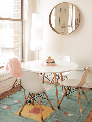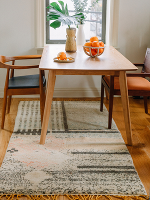 In a dining room, a large size rug can frame your table and chairs, making your guests feel extra welcome and comfortable.