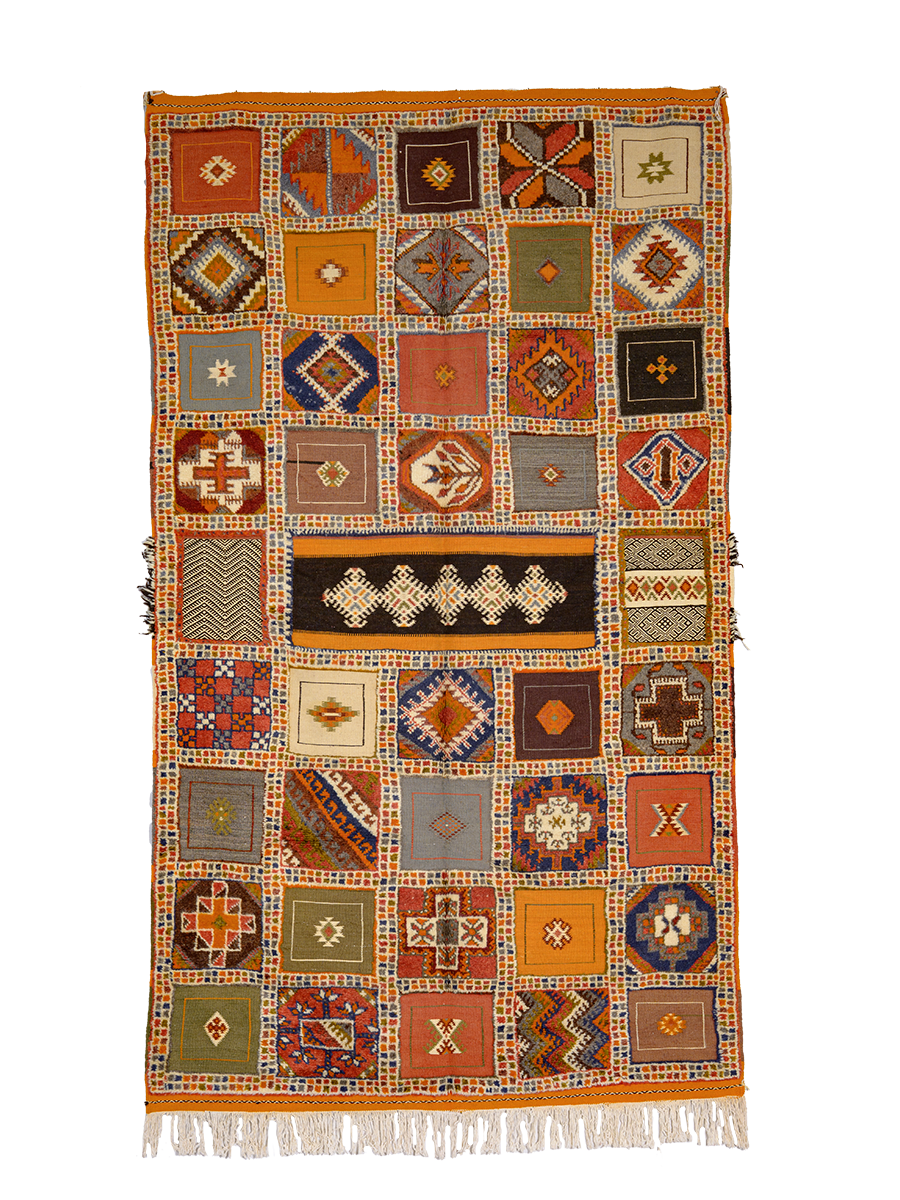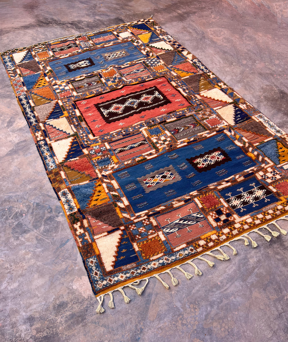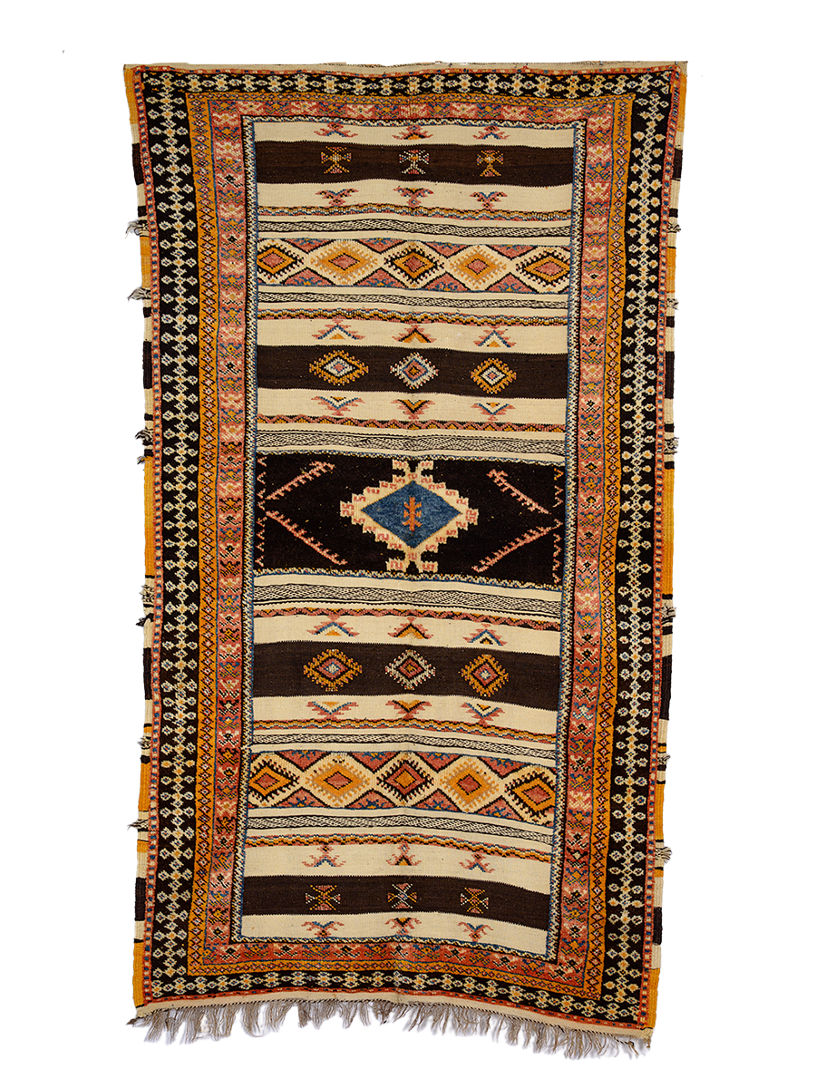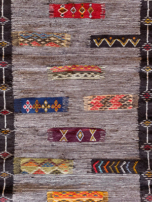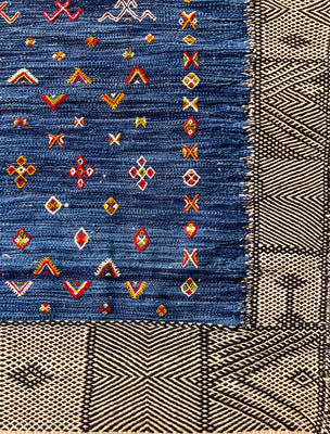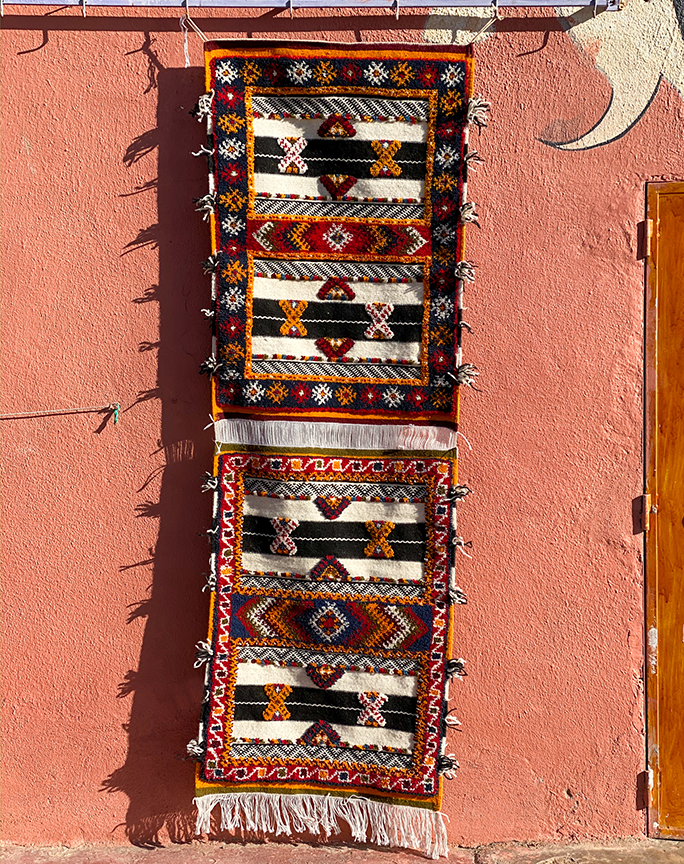 This style is thought to originate from the area in and around the Village of Tazenakht, an area rich with a weaving history. While the majority of this weave is flat, the design accents are either embroidered or have a slightly higher pile, giving this piece texture and dimension. Every design element comes entirely from the artisan’s imagination. The design elements within this technique tend to depict an array of symbolism in the Amazigh culture.