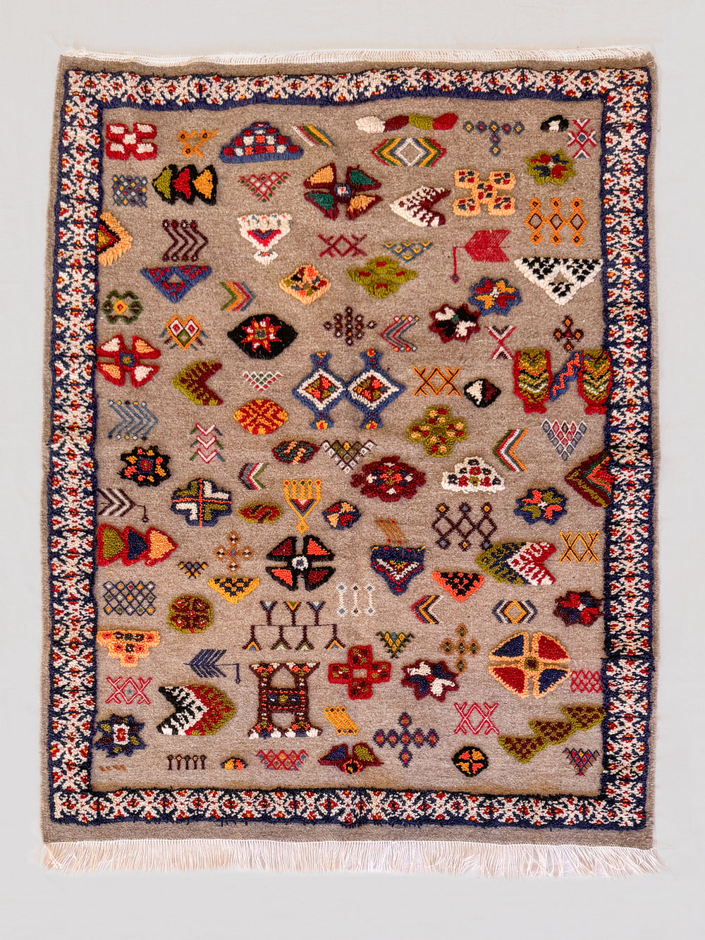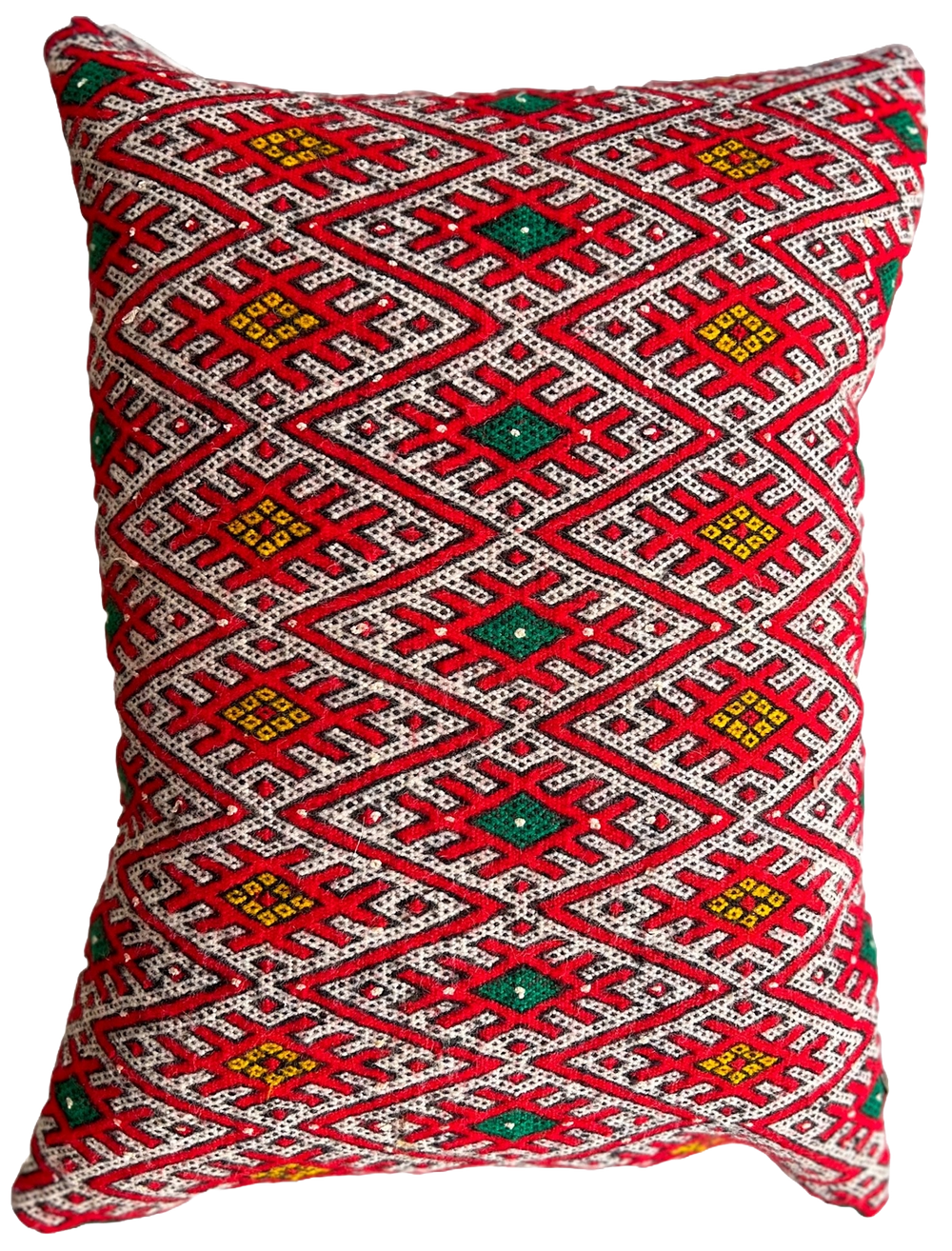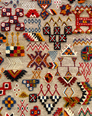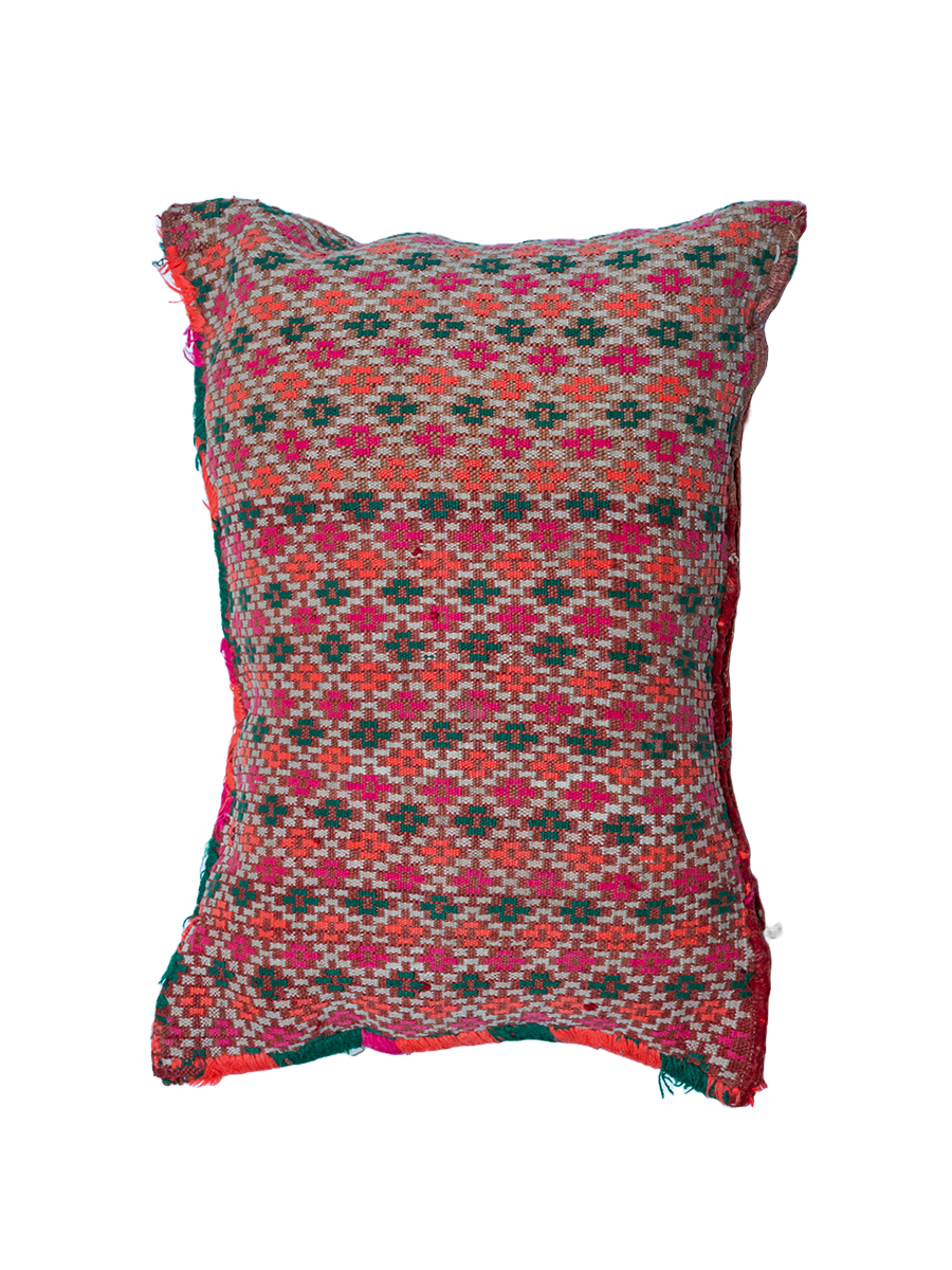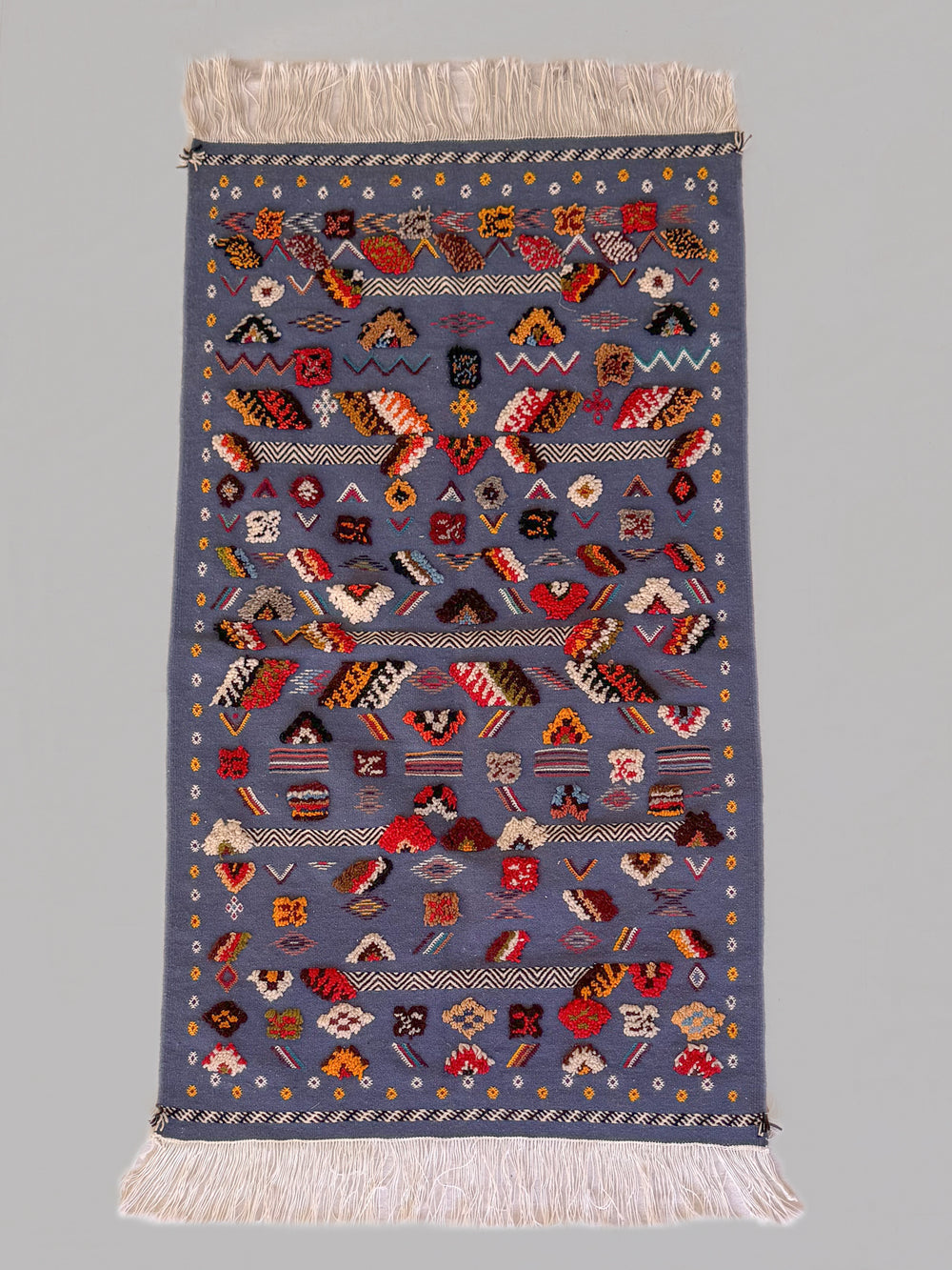 This style is thought to originate from the area in and around the Village of Tazenakht, an area rich with a weaving history. While the majority of this weave is flat, the design accents are either embroidered or have a slightly higher pile, giving this piece texture and dimension. Every design element comes entirely from the artisan’s imagination. The design elements within this technique tend to depict an array of symbolism in the Amazigh culture.