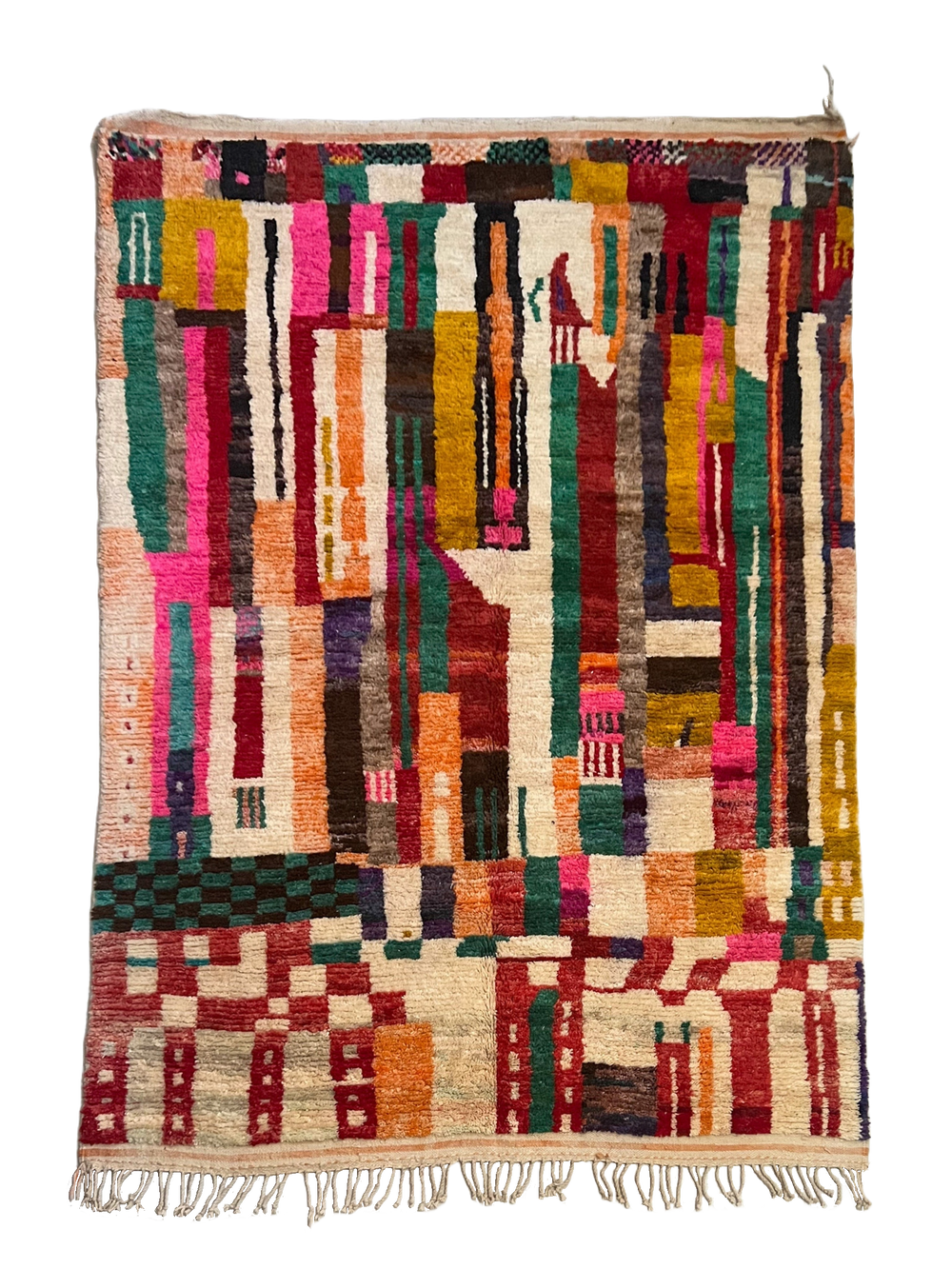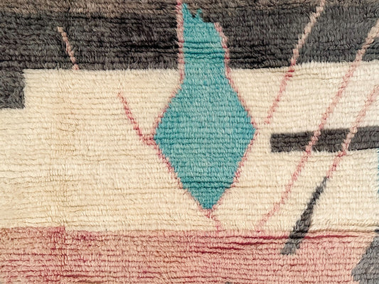 Boujad rugs originate from the Al Haouz region of Morocco and are celebrated for their distinctive and vibrant aesthetic. These rugs often showcase a myriad of bold colors. One of the defining features of Boujad rugs is their use of geometric shapes, abstract forms, and symbolic motifs passed down through generations, each telling a story of the weaver's cultural heritage and artistic expression. The weaving technique results in a less dense pile compared to other Moroccan rugs, giving them a distinct texture.