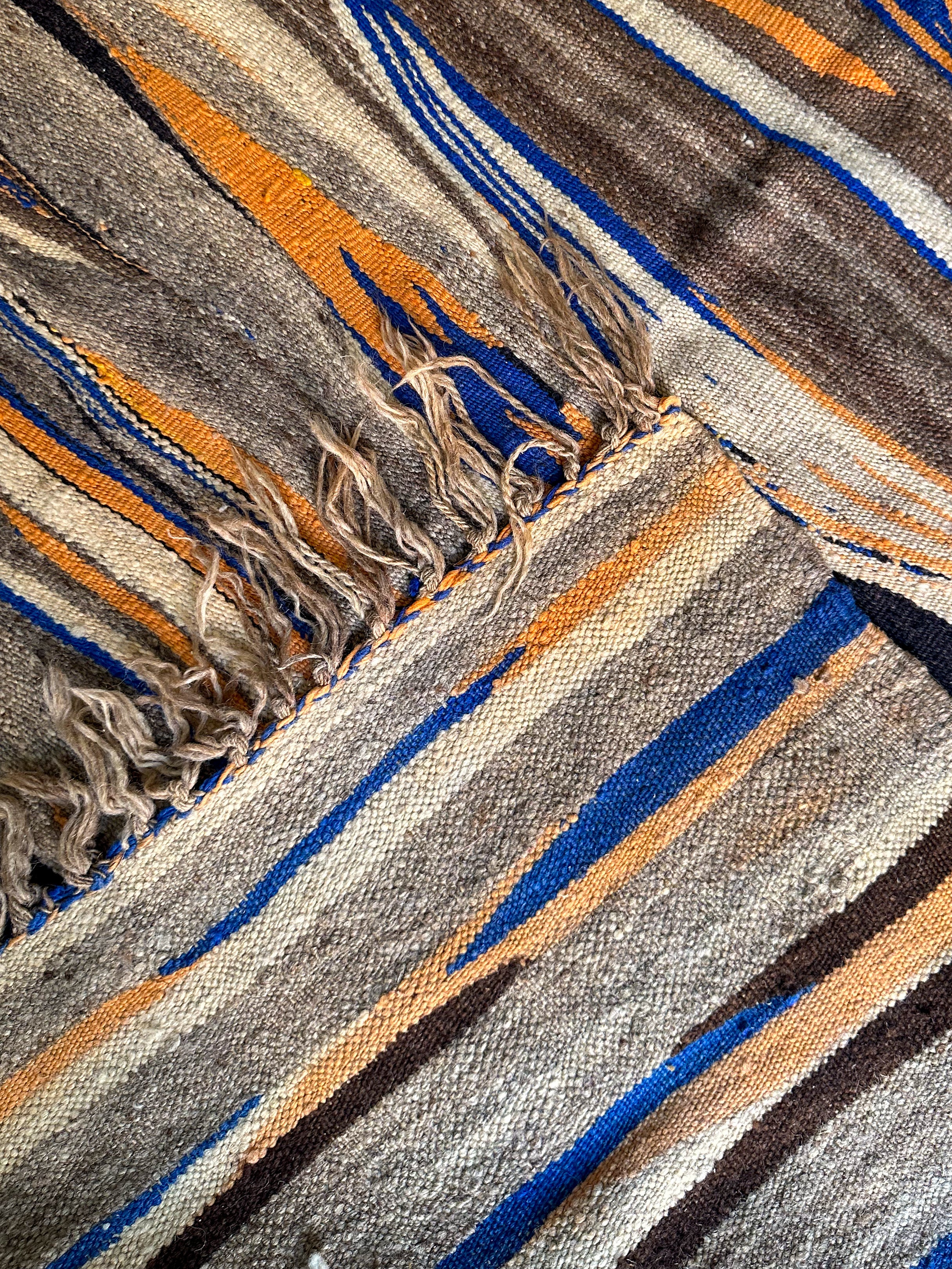 This rug style has a few different names; Golden Fingers, Kharita ("map" in Arabic) or Tazenakht. This complex weaving technique is usually made by the senior members of the Village. This technique consists of a maze of geometric shapes that has the same design on both sides which allows this rug to be reversible. This Flatweave is incredibly strong and will withstand the test of time.