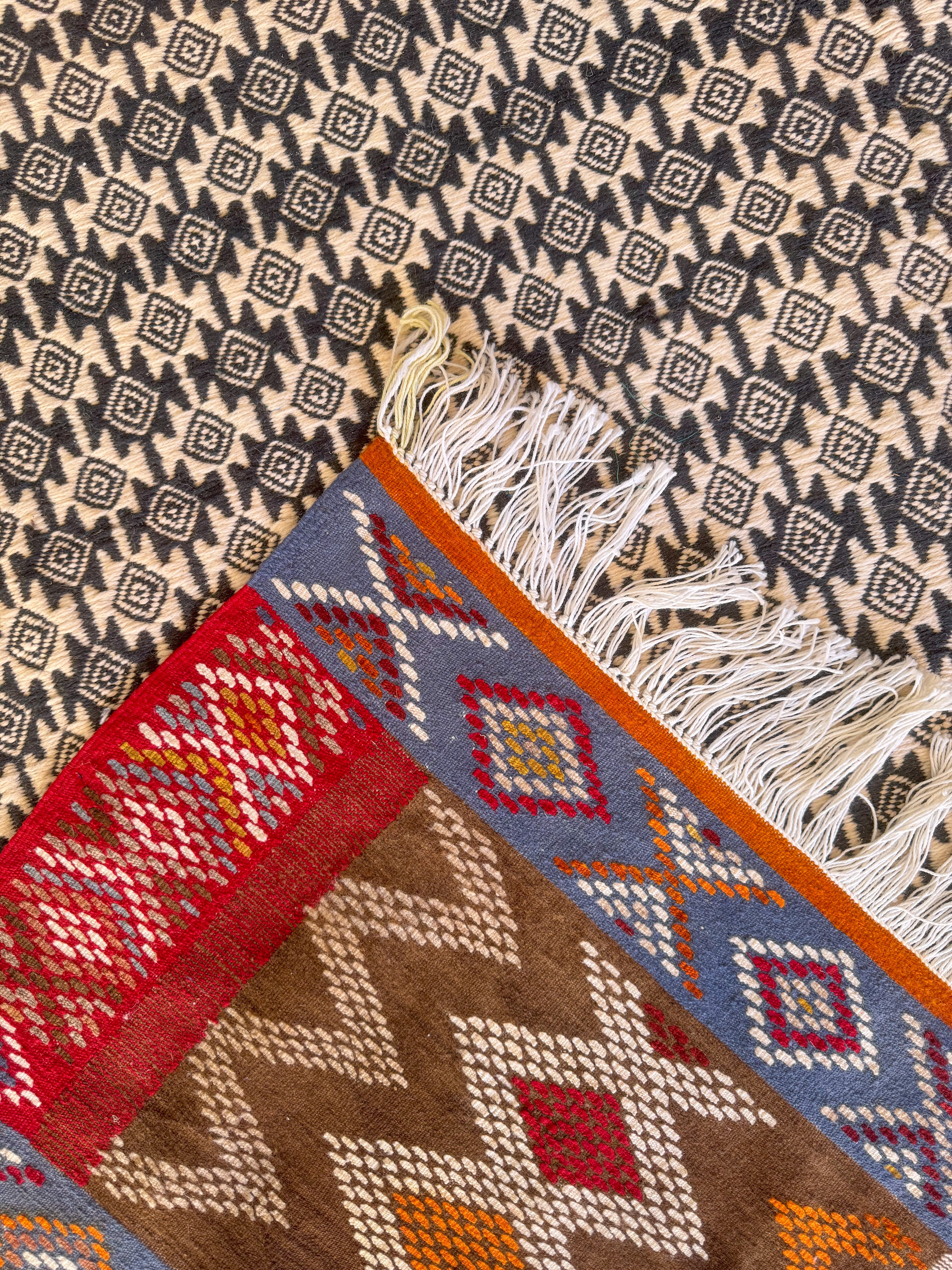 Mixed weaving techniques represent a new modern technique where the artisan will bring two techniques she specializes in. The combinations could be endless either combining two techniques such as Zanafi x Hand-Knot, or three Hand-Knot, Flatweave and Zanafi.