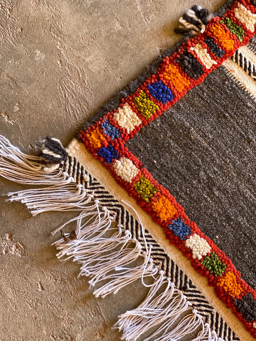 This style is thought to originate from the area in and around the Village of Tazenakht, an area rich with a weaving history. While the majority of this weave is flat, the design accents are either embroidered or have a slightly higher pile, giving this piece texture and dimension. Every design element comes entirely from the artisan’s imagination. The design elements within this technique tend to depict an array of symbolism in the Amazigh culture.
