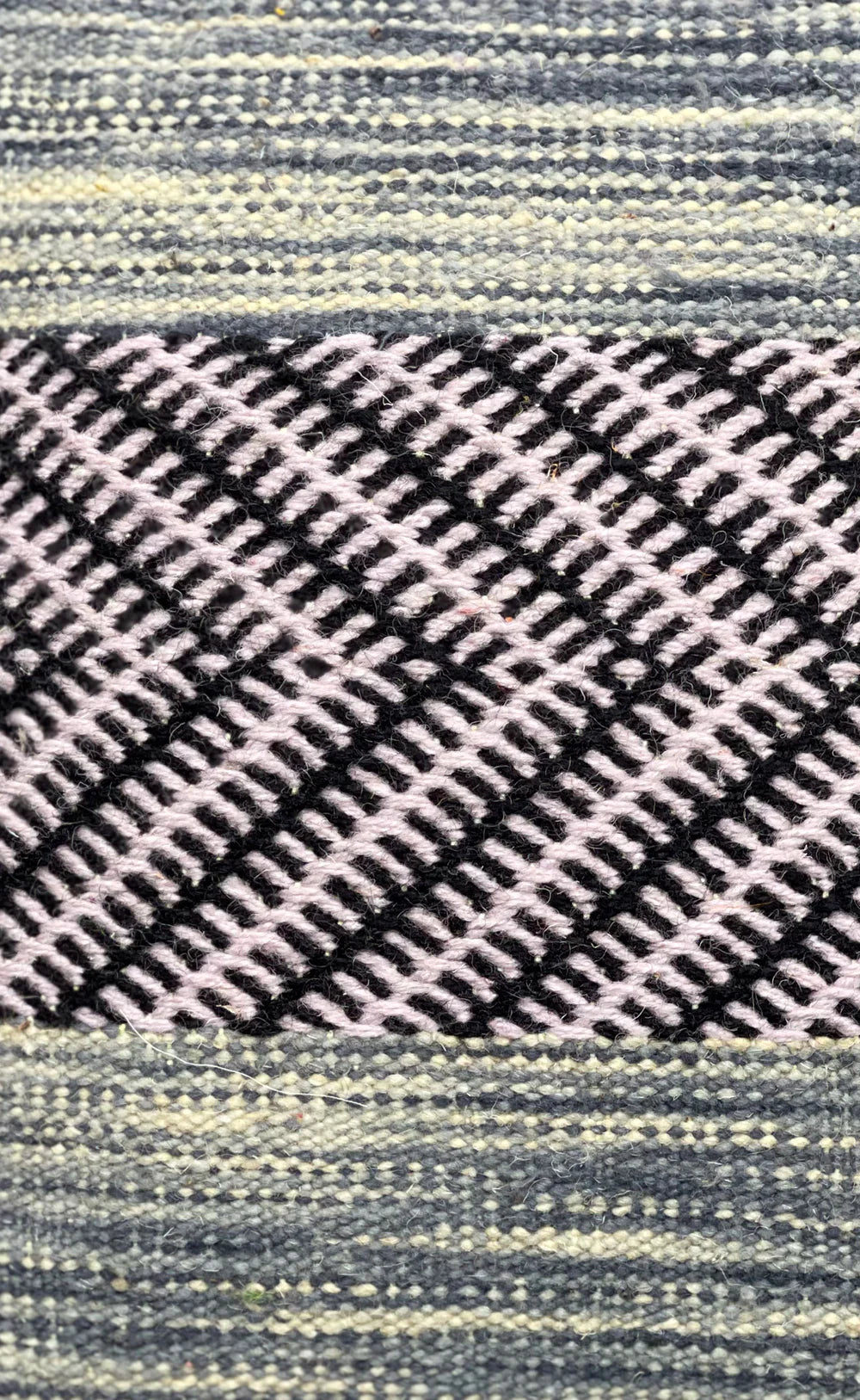 Mixed weaving techniques represent a new modern technique where the artisan will bring two techniques she specializes in. The combinations could be endless either combining two techniques such as Zanafi x Hand-Knot, or three Hand-Knot, Flatweave and Zanafi.
