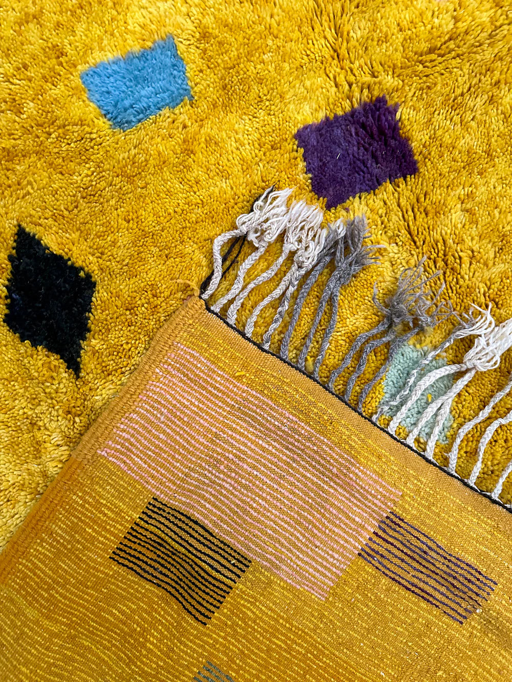 One significant difference in technique with this rug is the artisans usually pre-cut the wool prior to weaving on the loom, while the women in the north cut the wool after looping it around the loom.
