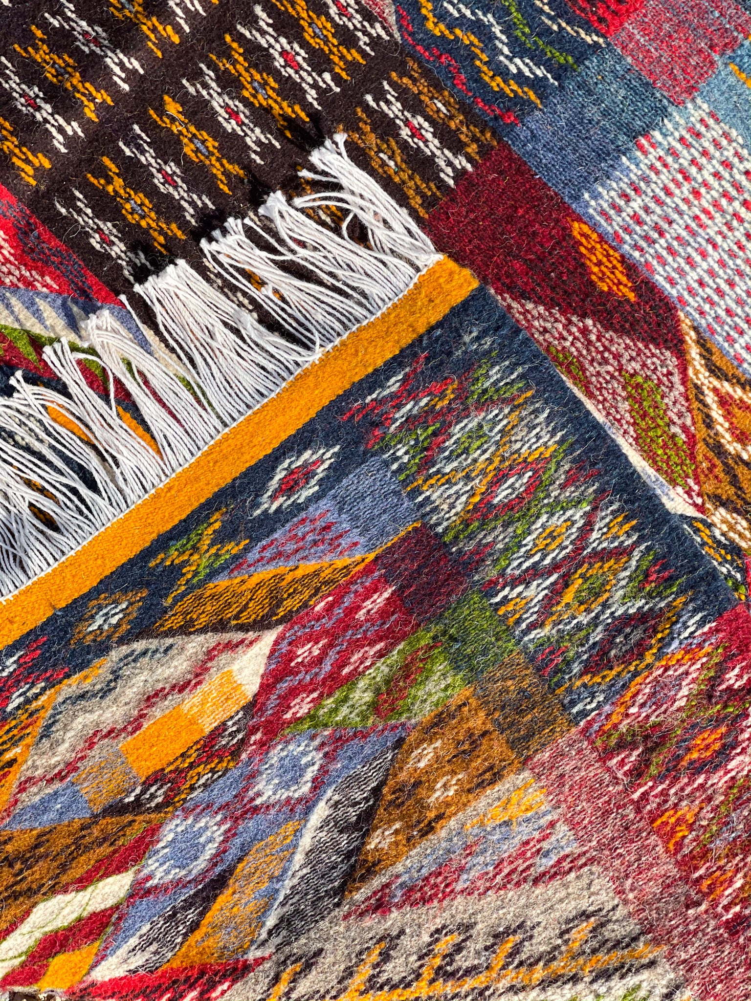 This rug style has a few different names; Golden Fingers, Kharita ("map" in Arabic) or Tazenakht. This complex weaving technique is usually made by the senior members of the Village. This technique consists of a maze of geometric shapes that has the same design on both sides which allows this rug to be reversible. This Flatweave is incredibly strong and will withstand the test of time.