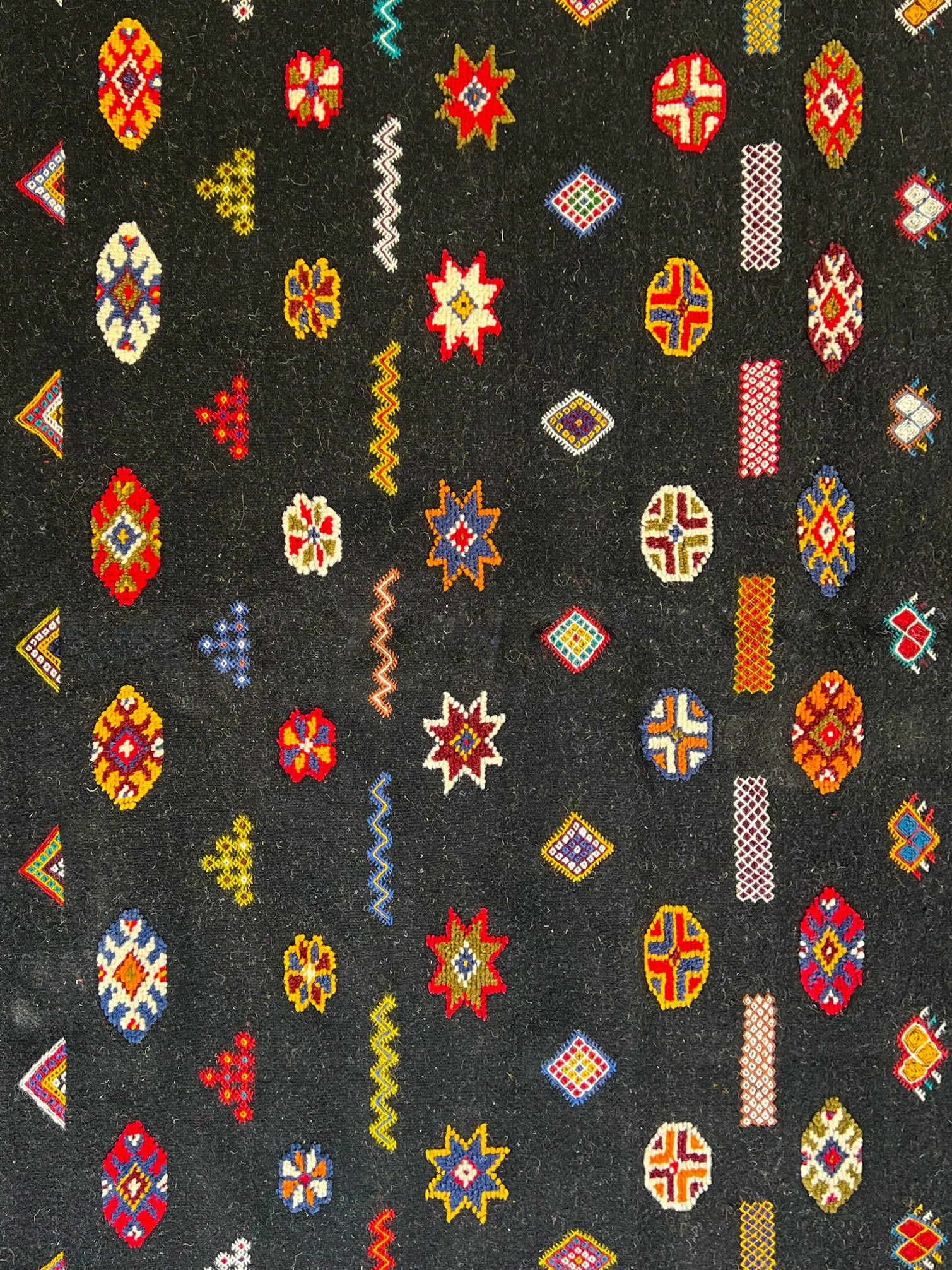 This style is thought to originate from the area in and around the Village of Tazenakht, an area rich with a weaving history. While the majority of this weave is flat, the design accents are either embroidered or have a slightly higher pile, giving this piece texture and dimension. Every design element comes entirely from the artisan’s imagination. The design elements within this technique tend to depict an array of symbolism in the Amazigh culture.