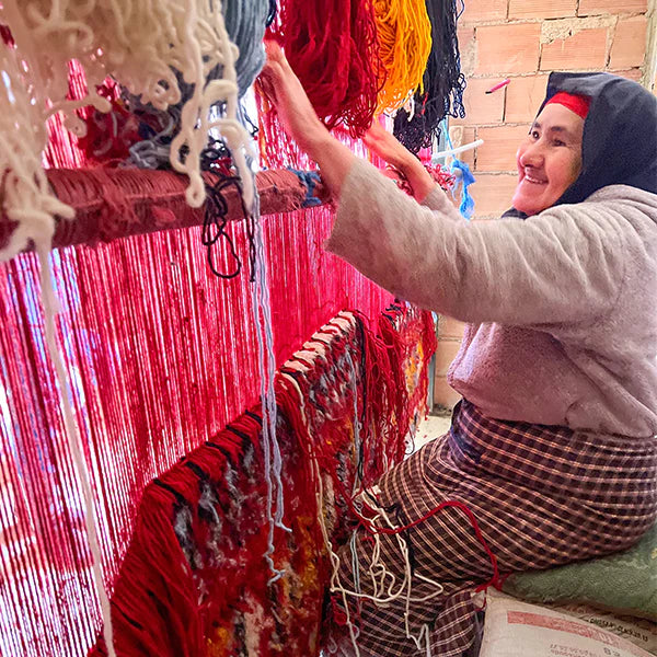 Soukina leads a group of 35 artisans from a village just outside Beni M’rirt in the Middle Atlas Mountains. Founded in the early 2000s by Soukina’s late mother, Ketlouma, the collective specializes in medium to high hand-knot rugs—a style named after the region—as well as M’rirt Zanafi rugs, their unique interpretation of the Zanafi style from the southeast. Traditional rugs from this area are crafted using a thick knotting technique, resulting in an extra-plush texture.