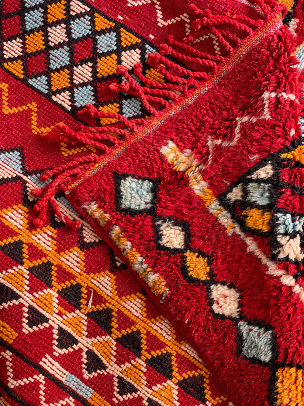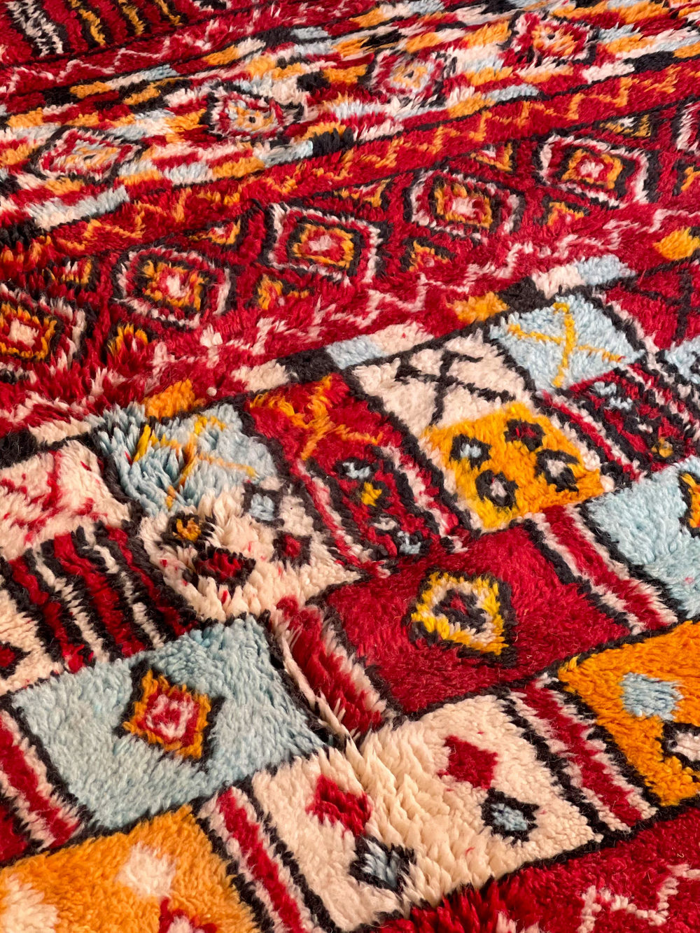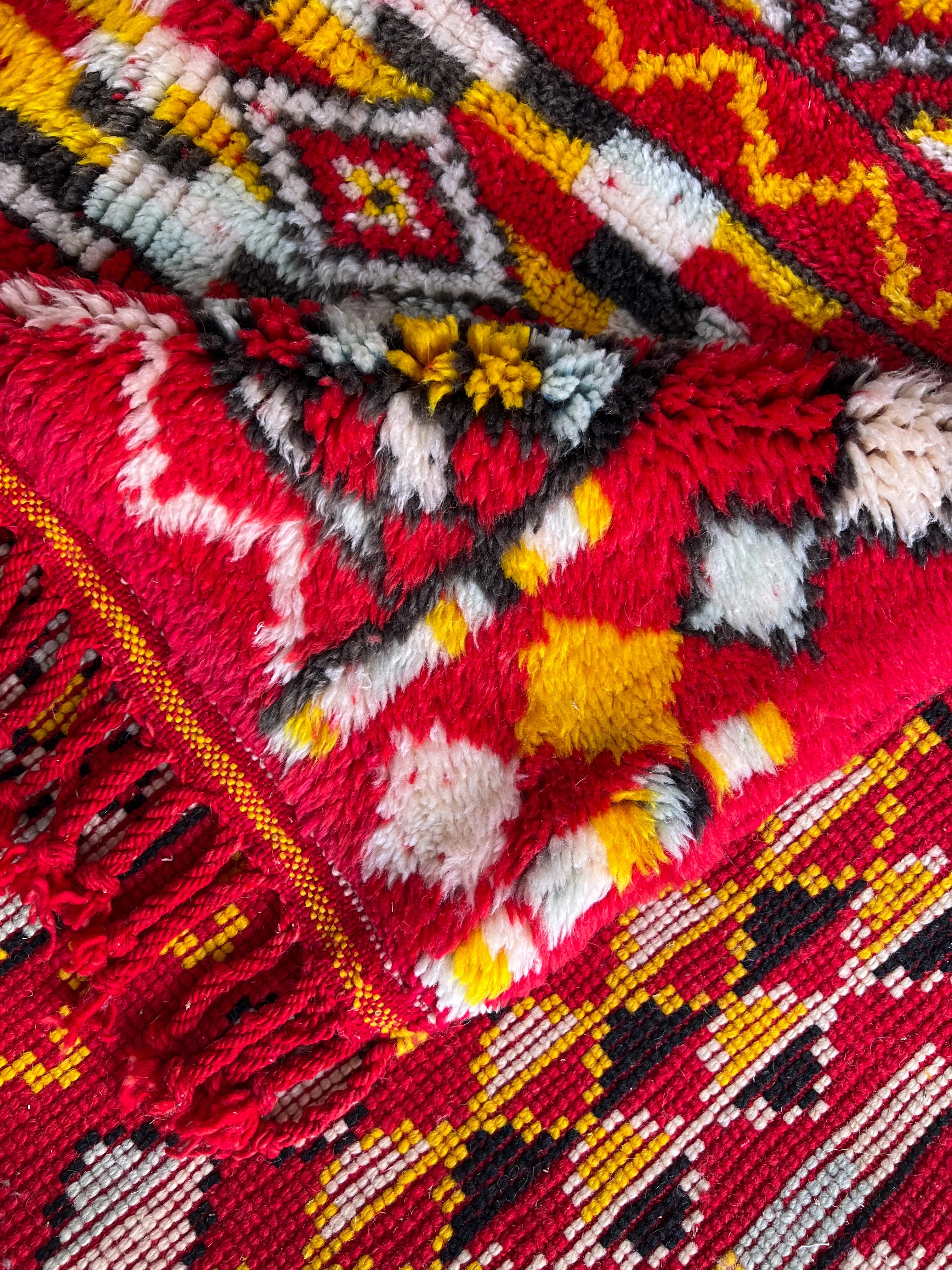 The majority of these rugs come from the Middle Atlas and High Atlas Mountains. The local sheep in these colder climates have a thicker coat to sustain them during the winter months, which impacts the thickness of the wool, and in turn, contributes to the height of the pile.
