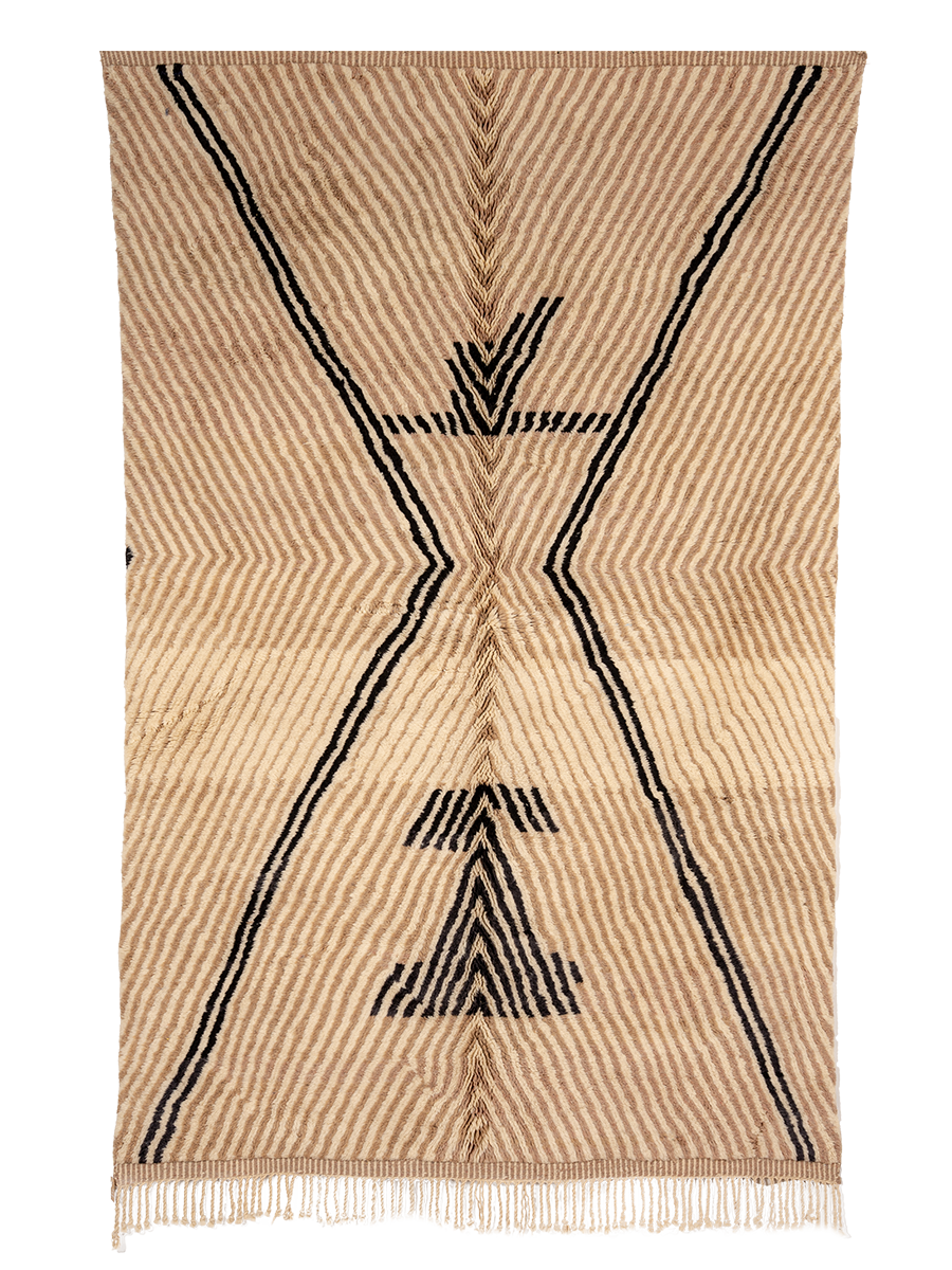 Soukina leads a group of 35 artisans from a village just outside Beni M’rirt in the Middle Atlas Mountains. Founded in the early 2000s by Soukina’s late mother, Ketlouma, the collective specializes in medium to high hand-knot rugs—a style named after the region—as well as M’rirt Zanafi rugs, their unique interpretation of the Zanafi style from the southeast. Traditional rugs from this area are crafted using a thick knotting technique, resulting in an extra-plush texture.