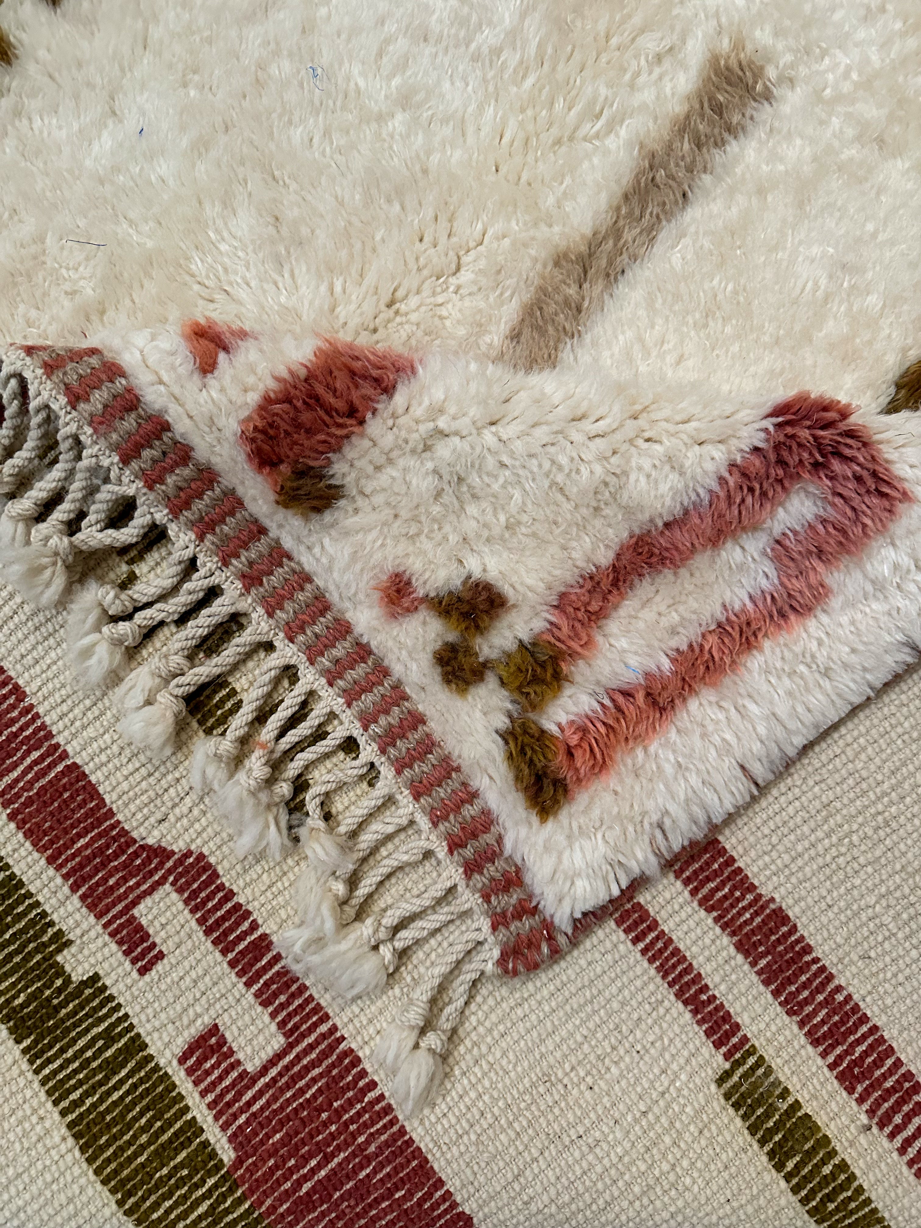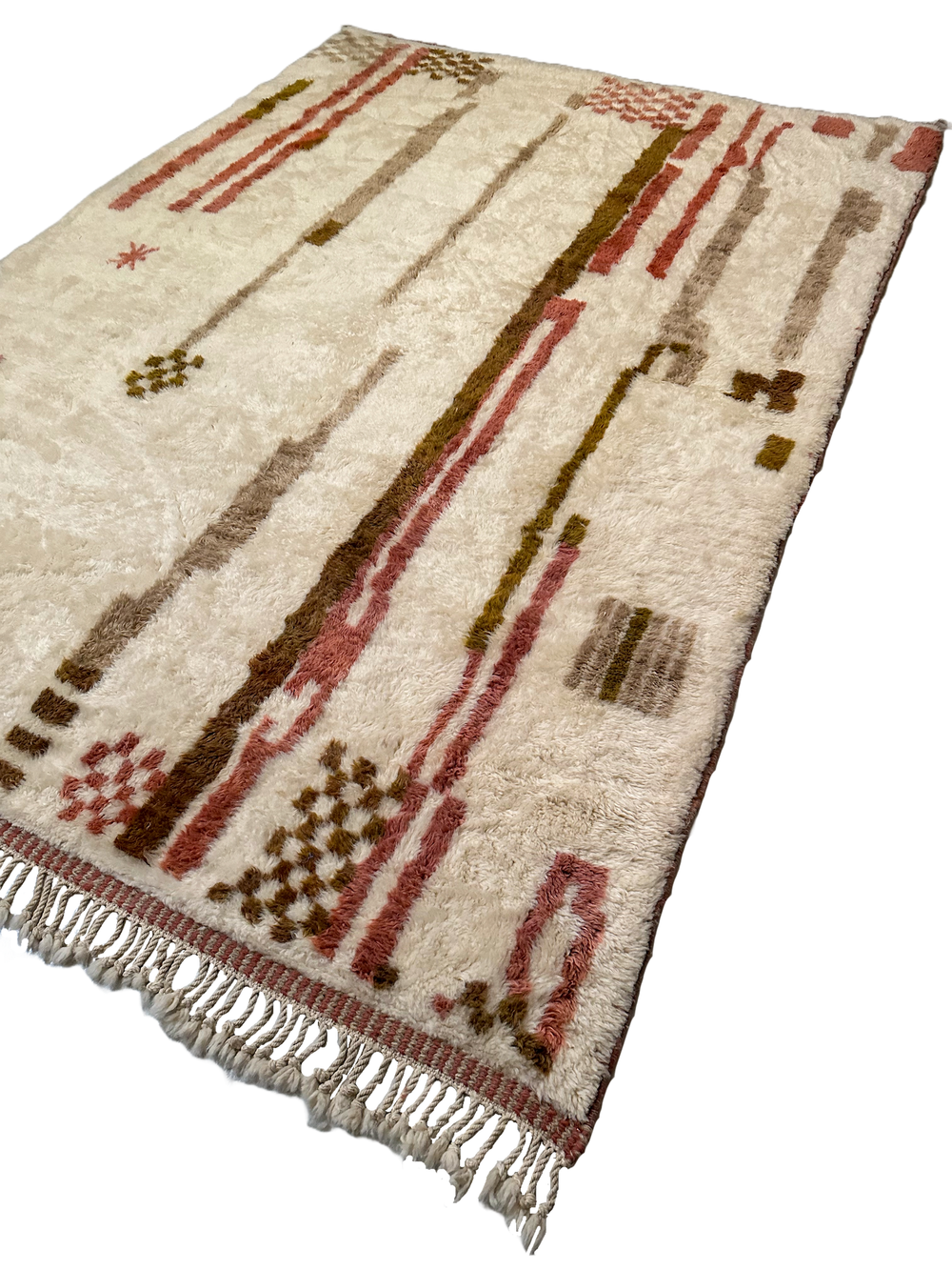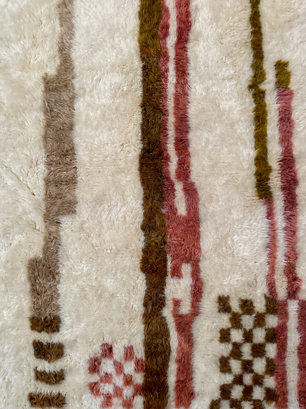 The majority of these rugs come from the Middle Atlas and High Atlas Mountains. The local sheep in these colder climates have a thicker coat to sustain them during the winter months, which impacts the thickness of the wool, and in turn, contributes to the height of the pile.