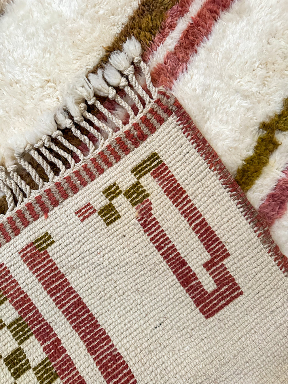 Soukina leads a group of 35 artisans from a village just outside Beni M’rirt in the Middle Atlas Mountains. Founded in the early 2000s by Soukina’s late mother, Ketlouma, the collective specializes in medium to high hand-knot rugs—a style named after the region—as well as M’rirt Zanafi rugs, their unique interpretation of the Zanafi style from the southeast. Traditional rugs from this area are crafted using a thick knotting technique, resulting in an extra-plush texture.