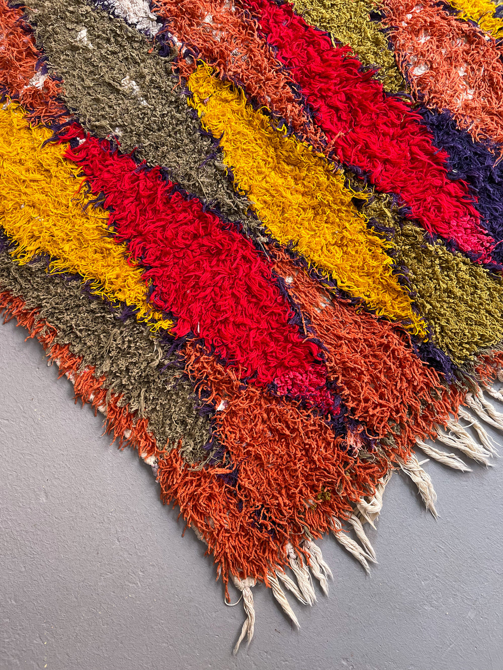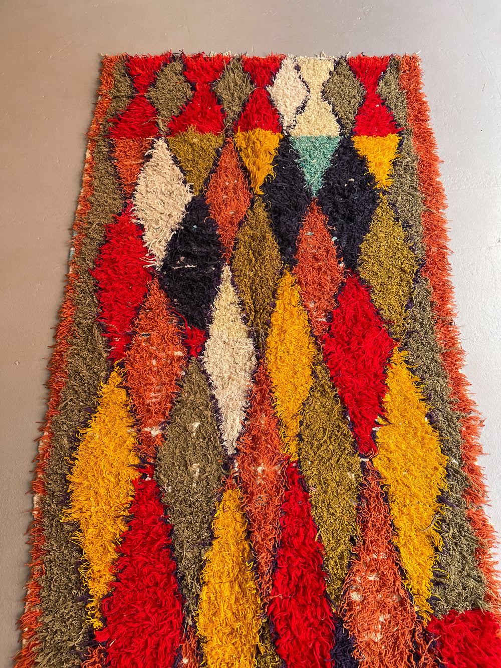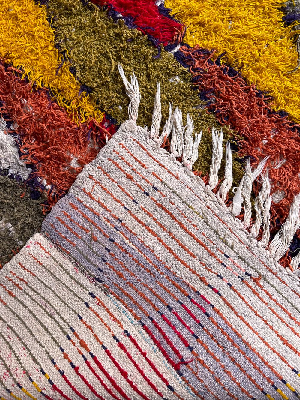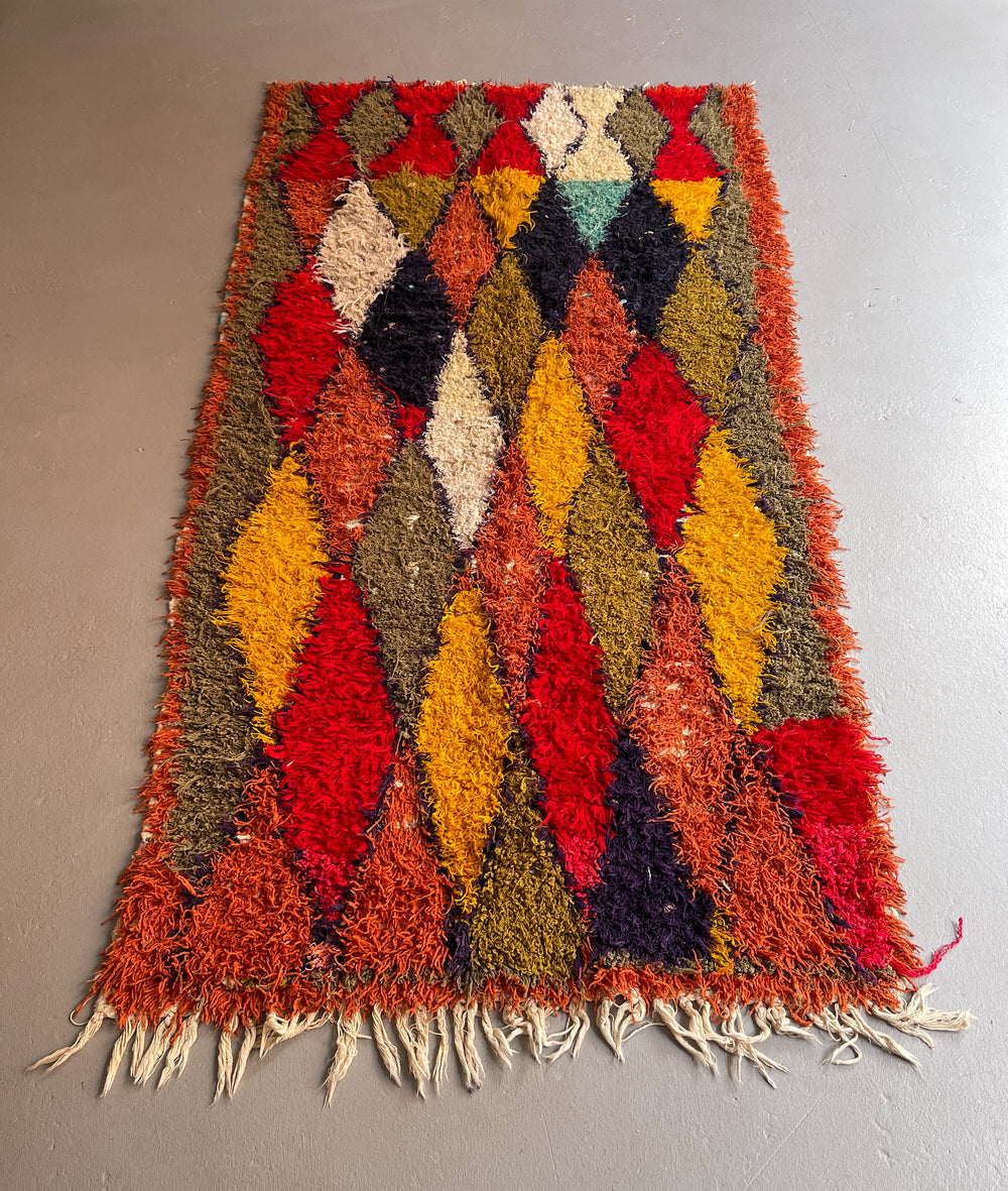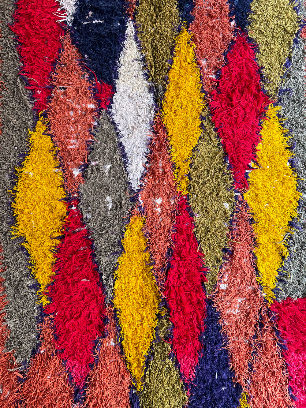 This rug technique is called Boucherouite (pronounced boo-shay-reet). These pieces are made from yarn, recycled clothing, or even textile scraps. Boucherouite rugs are often used in weavers’ own homes. In fact, this style of rug wasn’t traditionally sold but their vibrant, playful nature has made them popular.