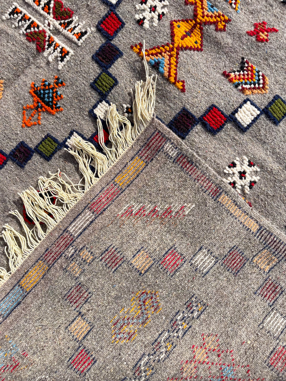 This style is thought to originate from the area in and around the Village of Tazenakht, an area rich with a weaving history. While the majority of this weave is flat, the design accents are either embroidered or have a slightly higher pile, giving this piece texture and dimension. Every design element comes entirely from the artisan’s imagination. The design elements within this technique tend to depict an array of symbolism in the Amazigh culture.