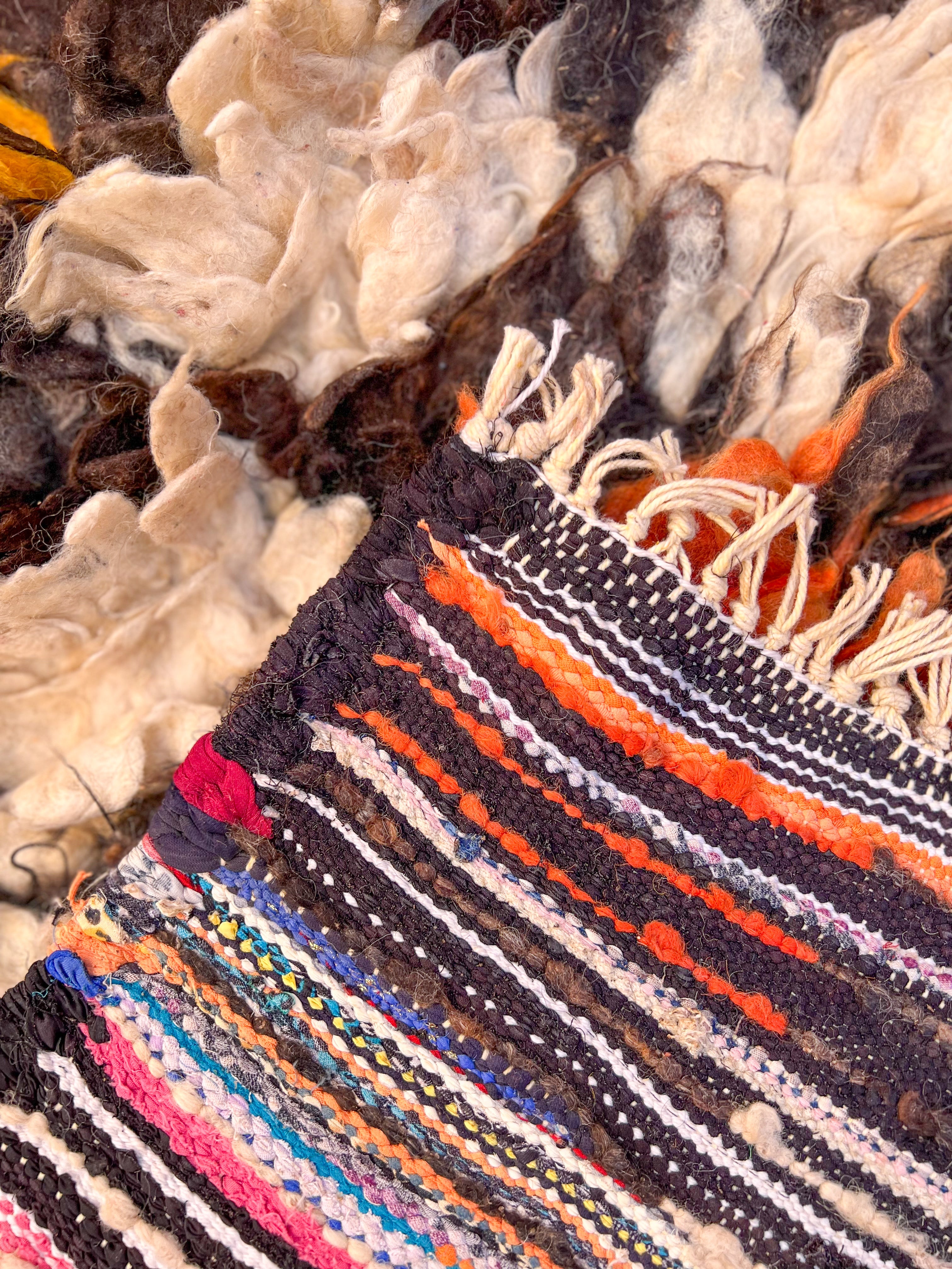 This rug technique is called Boucherouite (pronounced boo-shay-reet). These pieces are made from yarn, recycled clothing, or even textile scraps. Boucherouite rugs are often used in weavers’ own homes. In fact, this style of rug wasn’t traditionally sold but their vibrant, playful nature has made them popular.