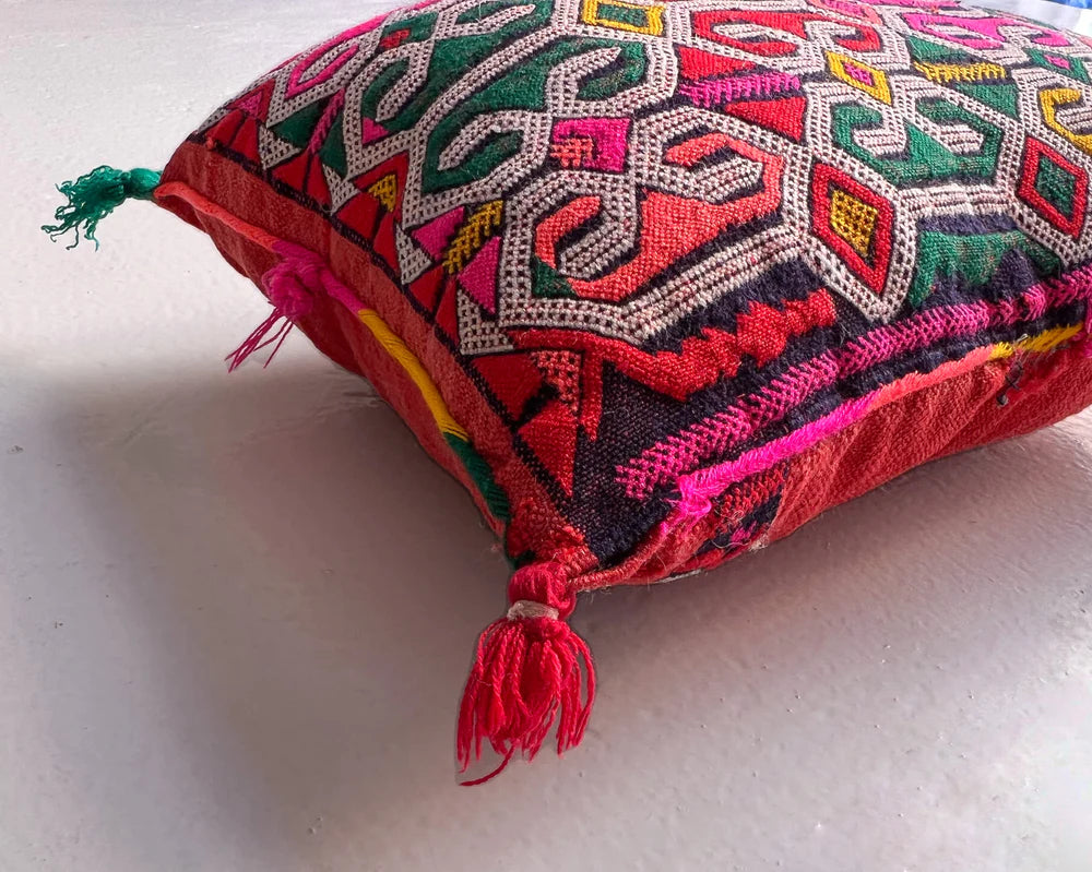 Located in the southeast of Morocco, Kalaat M’Gouna is most known for its Valley of the Roses, celebrated every May by a popular Rose Festival. Mina, the matriarch of this Association, grew up closer to Tazenakht and moved to Kalaat M’Gouna after marrying her husband. She began teaching the weaving craft to friends and neighbors decades ago. In 1995, she formed a small Association made up of Villagers and extended family. Today, there are still 10 members and they make low hand-knot, boucherouite, and kharita rugs.