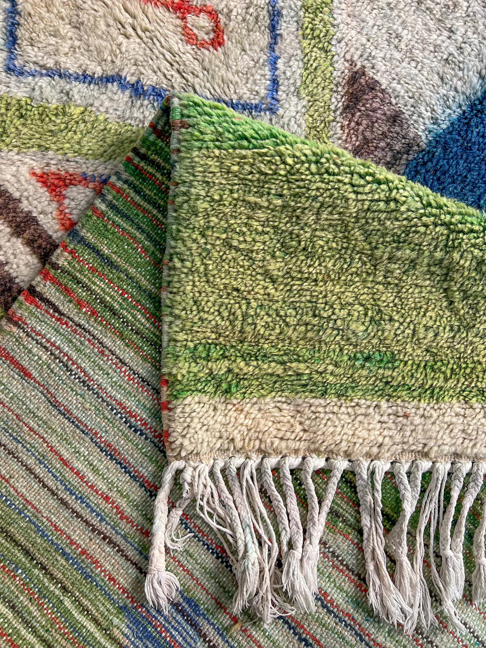 Boujad rugs originate from the Al Haouz region of Morocco and are celebrated for their distinctive and vibrant aesthetic. These rugs often showcase a myriad of bold colors. One of the defining features of Boujad rugs is their use of geometric shapes, abstract forms, and symbolic motifs passed down through generations, each telling a story of the weaver's cultural heritage and artistic expression. The weaving technique results in a less dense pile compared to other Moroccan rugs, giving them a distinct texture.