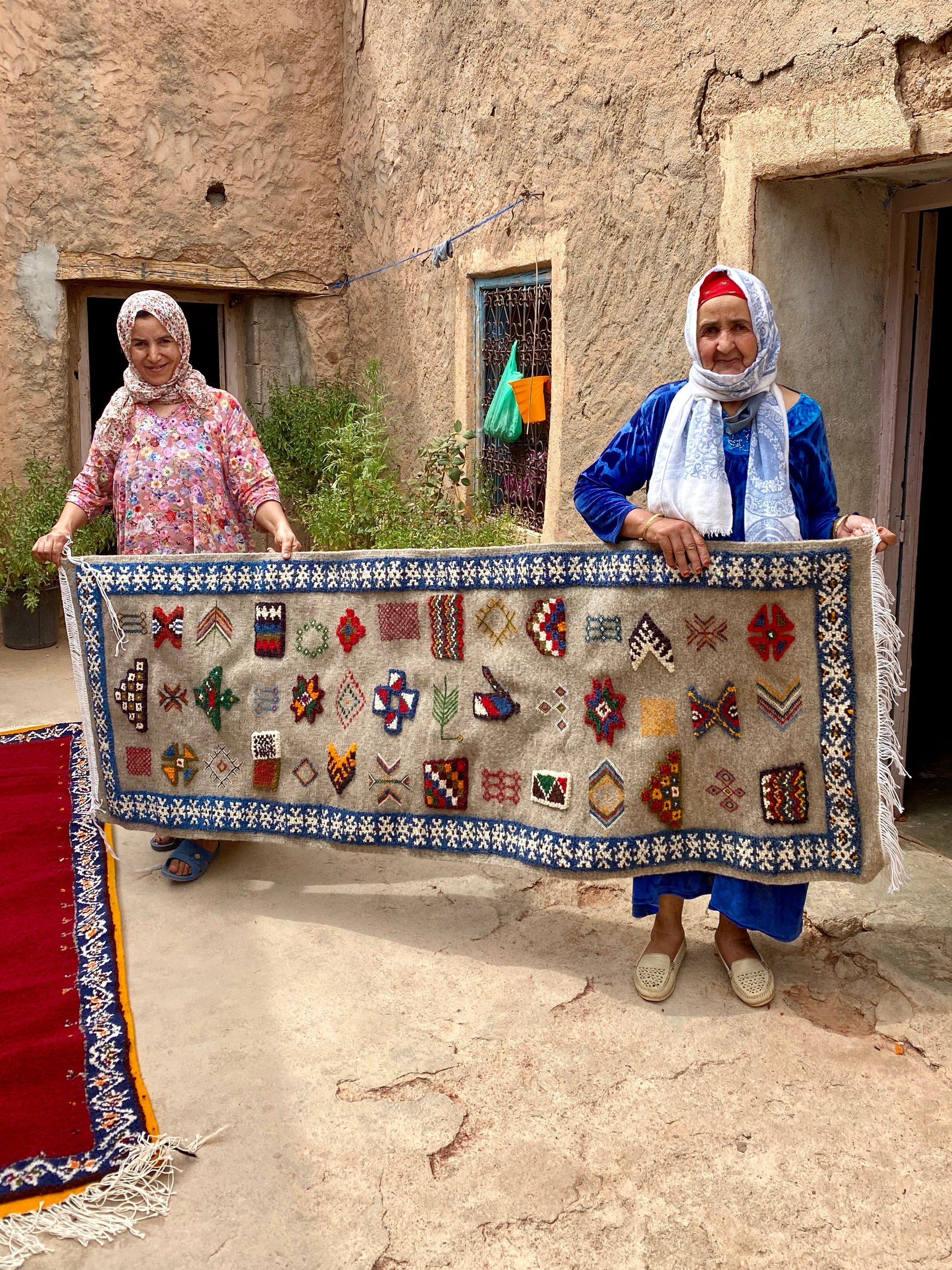 Mbarka and Khadija were the first artisans we ever worked with and through the years they have become our extended family. Residing just outside the old Village of Tazenakht, this mother-daughter duo has been weaving together for decades. They both specialize in the intricate hanbel technique and, depending on how big the rug is, they will enlist the help of their neighbors, cousins, or siblings to help complete the piece.