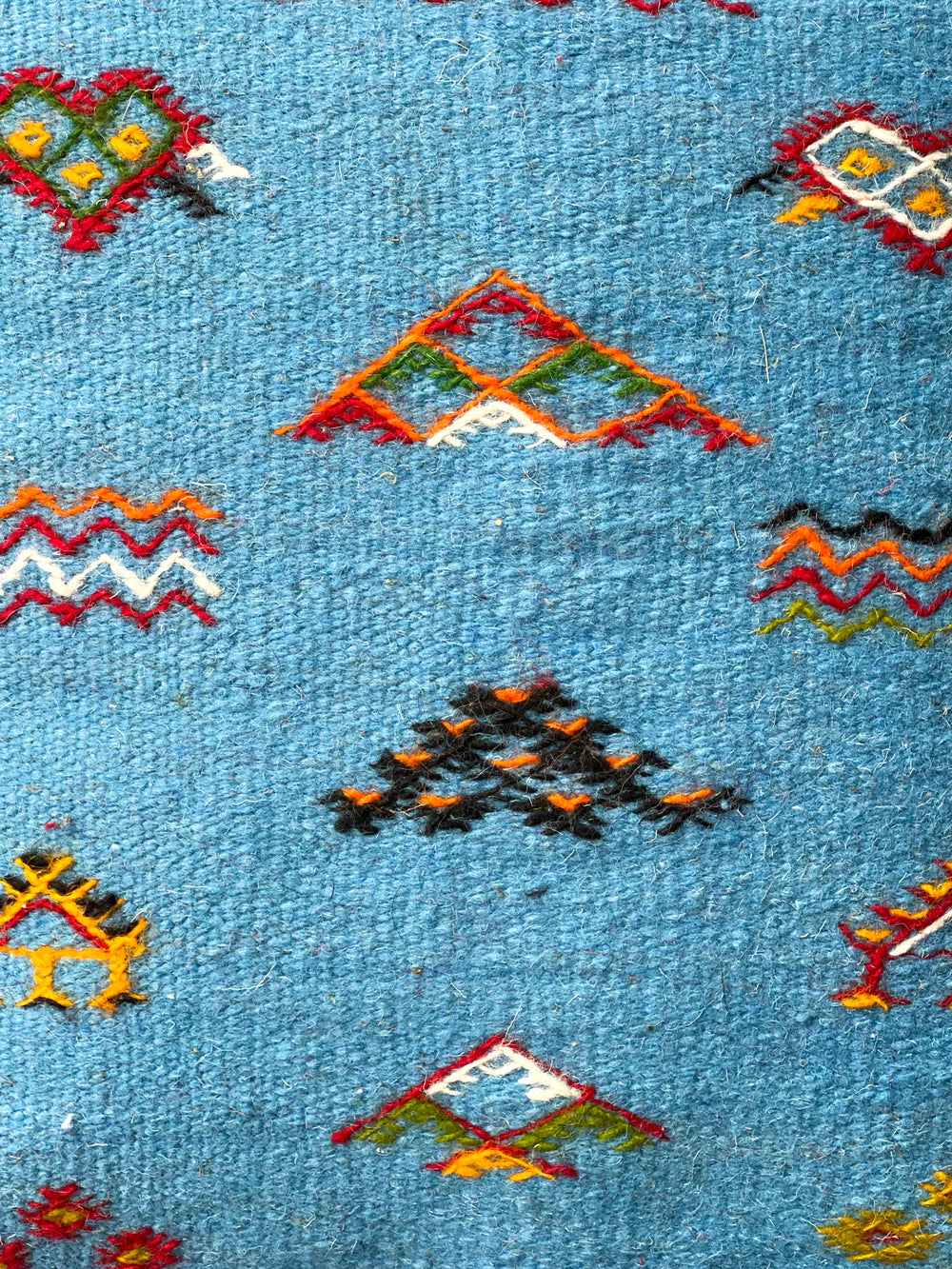This style is thought to originate from the area in and around the Village of Tazenakht, an area rich with a weaving history. While the majority of this weave is flat, the design accents are either embroidered or have a slightly higher pile, giving this piece texture and dimension. Every design element comes entirely from the artisan’s imagination. The design elements within this technique tend to depict an array of symbolism in the Amazigh culture.