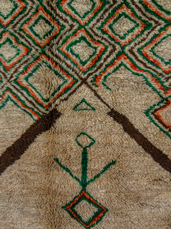 The majority of these rugs come from the Middle Atlas and High Atlas Mountains. The local sheep in these colder climates have a thicker coat to sustain them during the winter months, which impacts the thickness of the wool, and in turn, contributes to the height of the pile.
