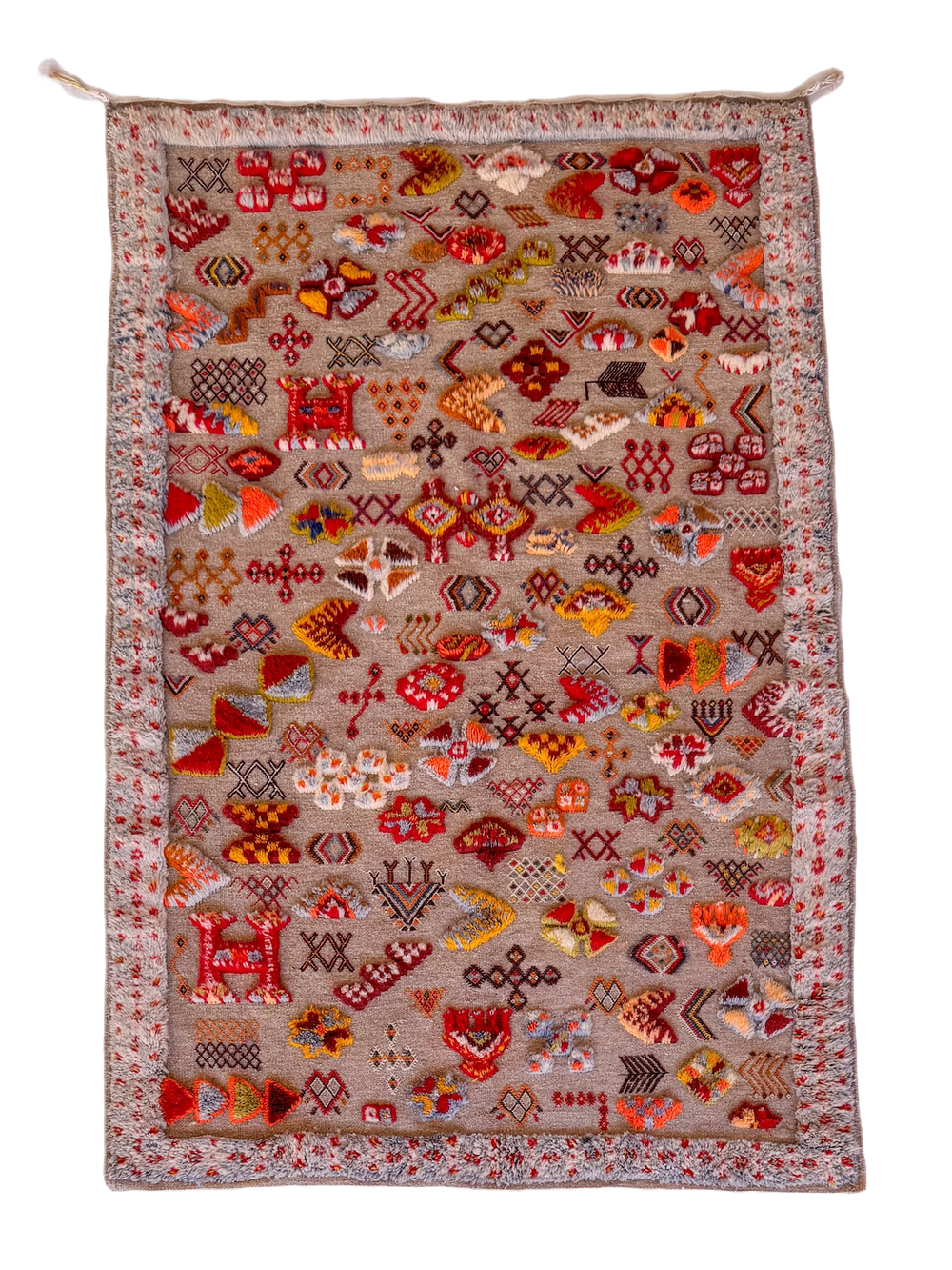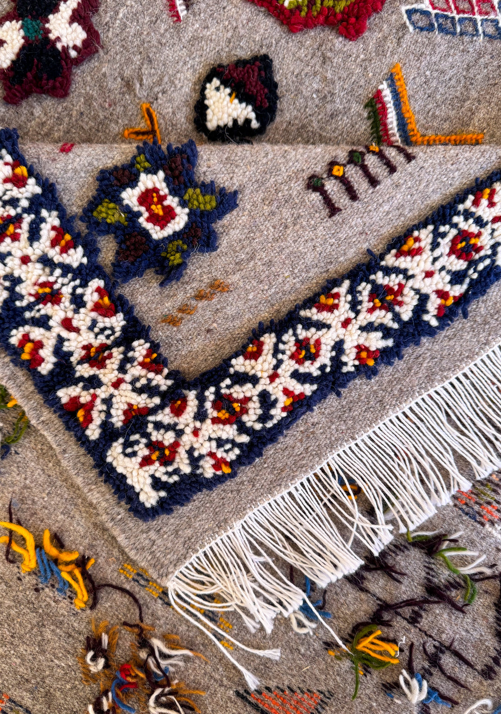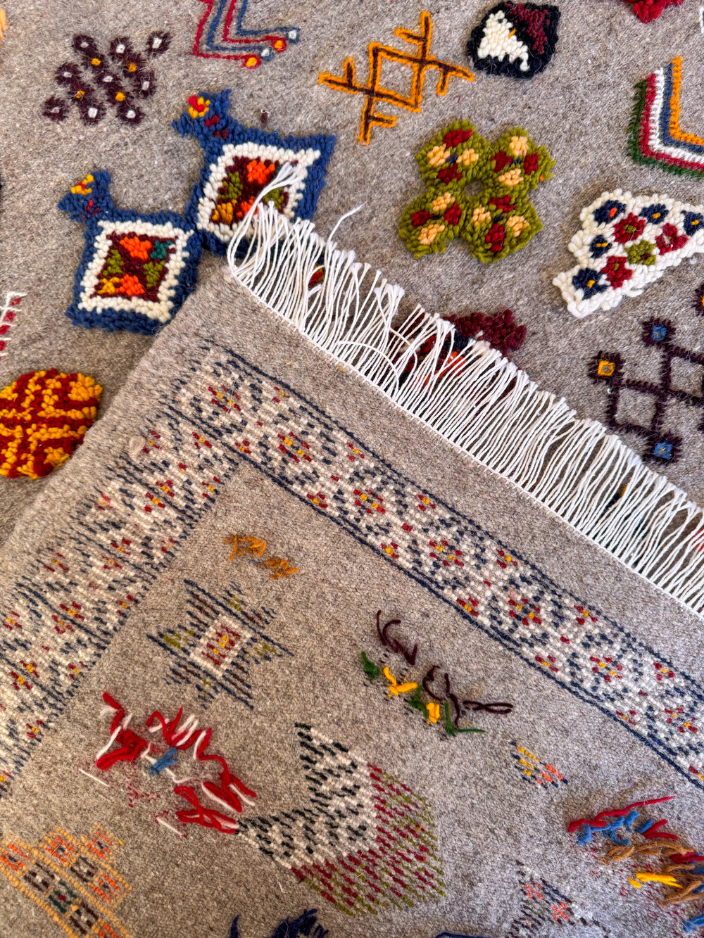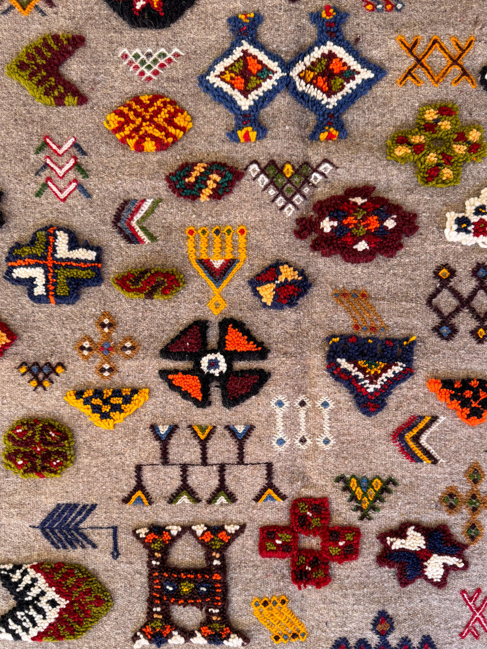 This style is thought to originate from the area in and around the Village of Tazenakht, an area rich with a weaving history. While the majority of this weave is flat, the design accents are either embroidered or have a slightly higher pile, giving this piece texture and dimension. Every design element comes entirely from the artisan’s imagination. The design elements within this technique tend to depict an array of symbolism in the Amazigh culture.