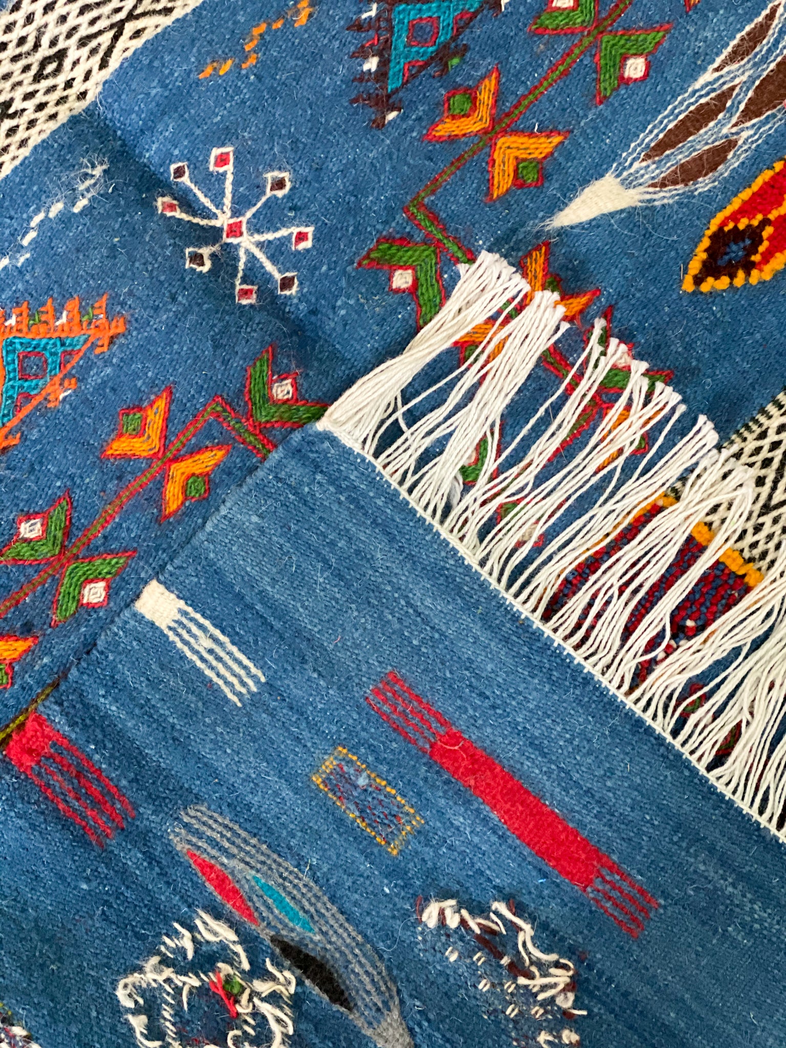 This style is thought to originate from the area in and around the Village of Tazenakht, an area rich with a weaving history. While the majority of this weave is flat, the design accents are either embroidered or have a slightly higher pile, giving this piece texture and dimension. Every design element comes entirely from the artisan’s imagination. The design elements within this technique tend to depict an array of symbolism in the Amazigh culture.