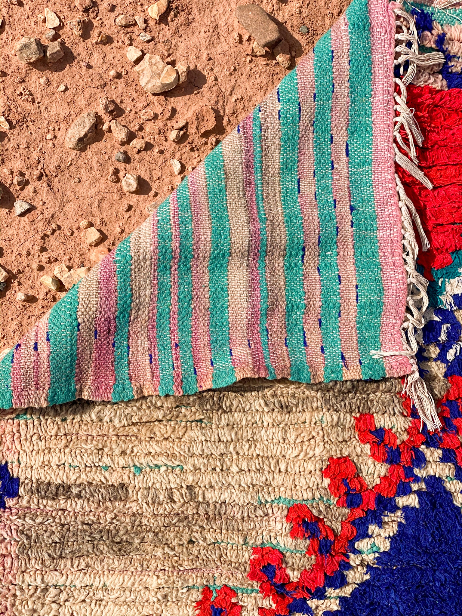 Located in the southeast of Morocco, Kalaat M’Gouna is most known for its Valley of the Roses, celebrated every May by a popular Rose Festival. Mina, the matriarch of this Association, grew up closer to Tazenakht and moved to Kalaat M’Gouna after marrying her husband. She began teaching the weaving craft to friends and neighbors decades ago. In 1995, she formed a small Association made up of Villagers and extended family. Today, there are still 10 members and they make low hand-knot, boucherouite, and kharita rugs.