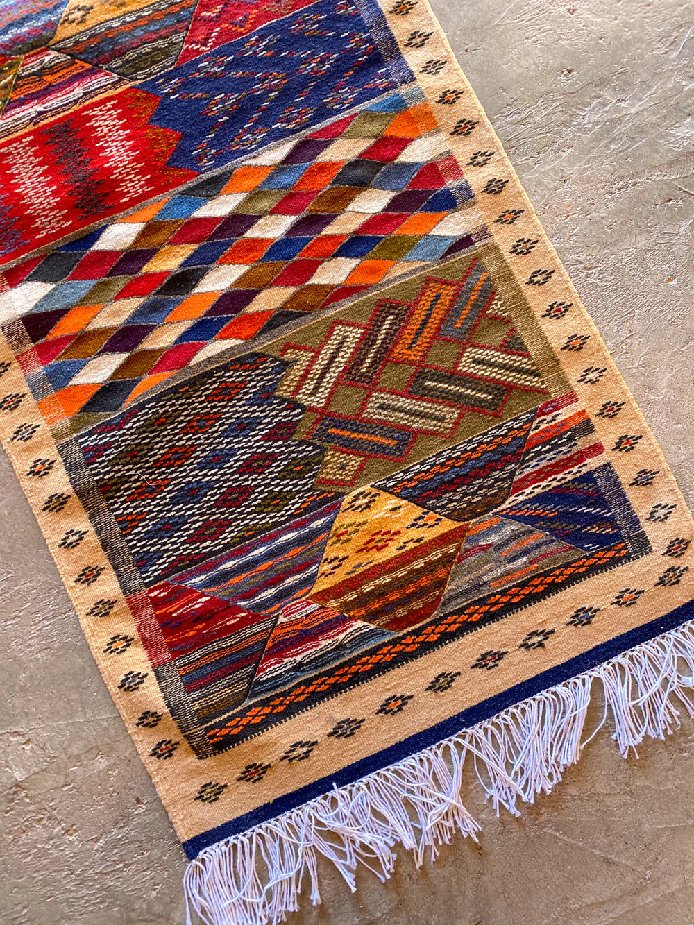 This rug style has a few different names; Golden Fingers, Kharita ("map" in Arabic) or Tazenakht. This complex weaving technique is usually made by the senior members of the Village. This technique consists of a maze of geometric shapes that has the same design on both sides which allows this rug to be reversible. This Flatweave is incredibly strong and will withstand the test of time.