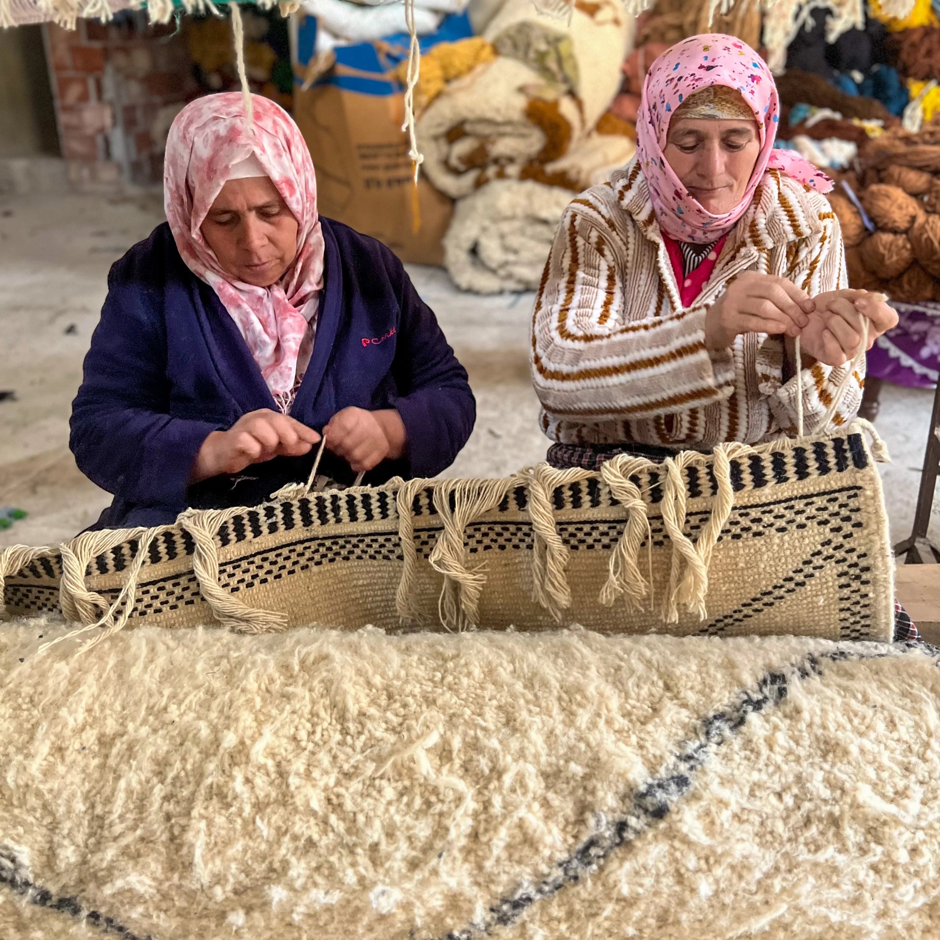 Soukina leads a group of 35 artisans from a village just outside Beni M’rirt in the Middle Atlas Mountains. Founded in the early 2000s by Soukina’s late mother, Ketlouma, the collective specializes in medium to high hand-knot rugs—a style named after the region—as well as M’rirt Zanafi rugs, their unique interpretation of the Zanafi style from the southeast. Traditional rugs from this area are crafted using a thick knotting technique, resulting in an extra-plush texture.