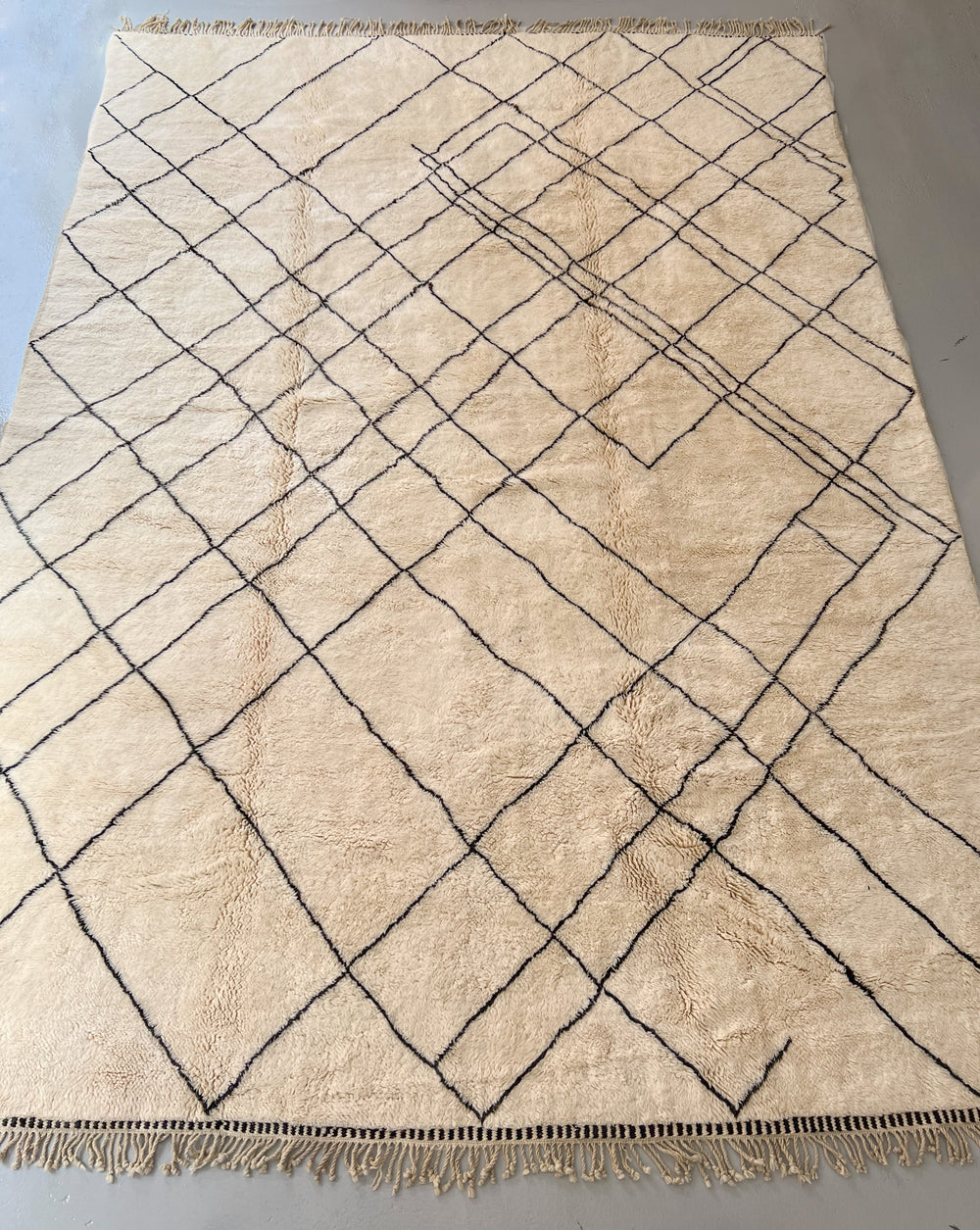 Soukina leads a group of 35 artisans from a village just outside Beni M’rirt in the Middle Atlas Mountains. Founded in the early 2000s by Soukina’s late mother, Ketlouma, the collective specializes in medium to high hand-knot rugs—a style named after the region—as well as M’rirt Zanafi rugs, their unique interpretation of the Zanafi style from the southeast. Traditional rugs from this area are crafted using a thick knotting technique, resulting in an extra-plush texture.