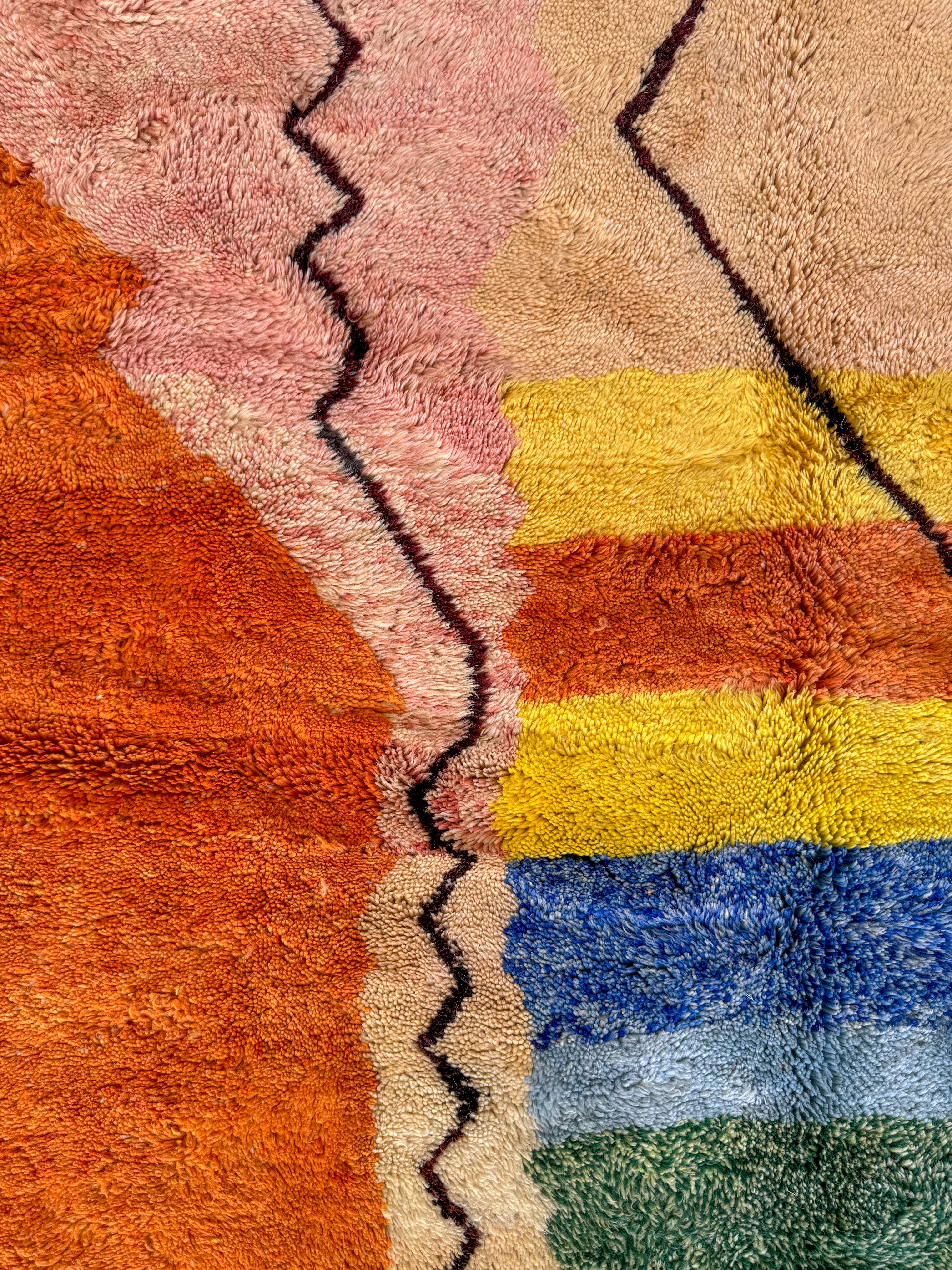 The majority of these rugs come from the Middle Atlas and High Atlas Mountains. The local sheep in these colder climates have a thicker coat to sustain them during the winter months, which impacts the thickness of the wool, and in turn, contributes to the height of the pile.