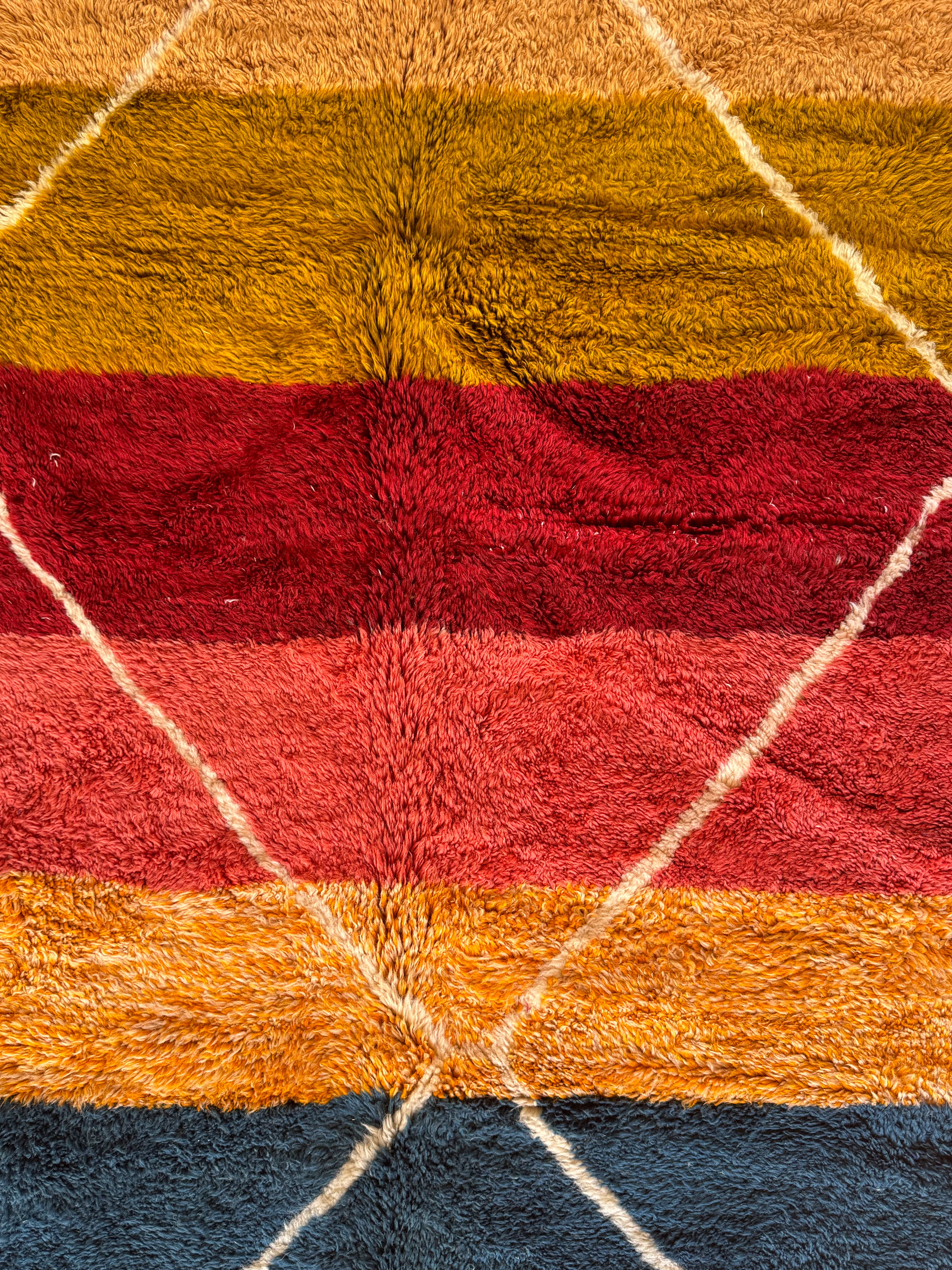 The majority of these rugs come from the Middle Atlas and High Atlas Mountains. The local sheep in these colder climates have a thicker coat to sustain them during the winter months, which impacts the thickness of the wool, and in turn, contributes to the height of the pile.