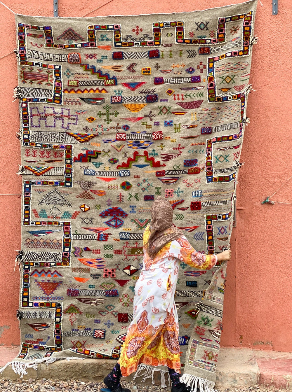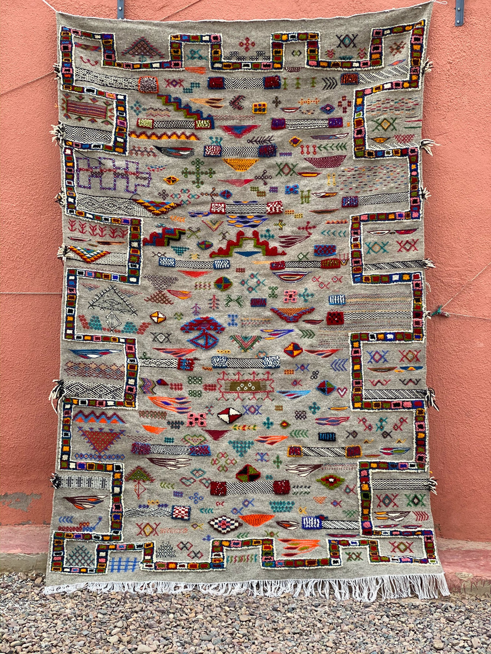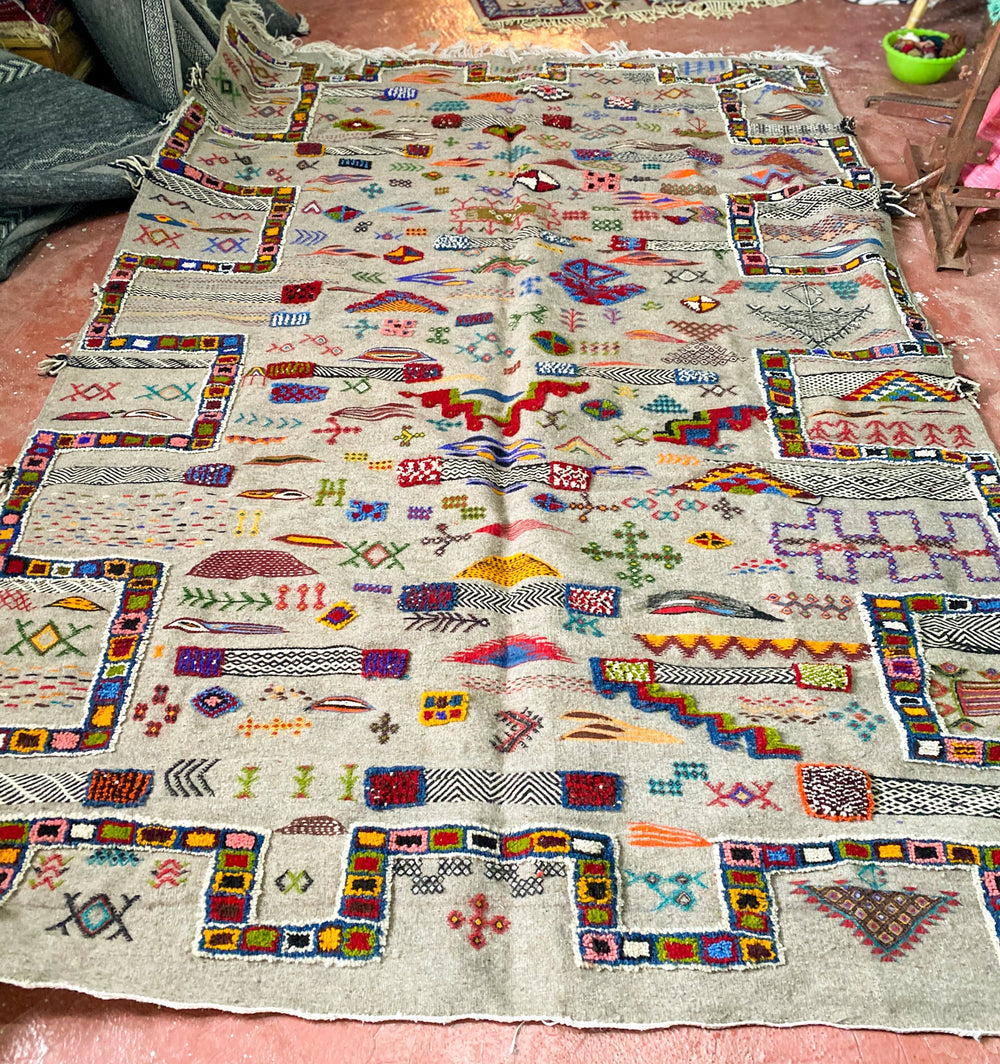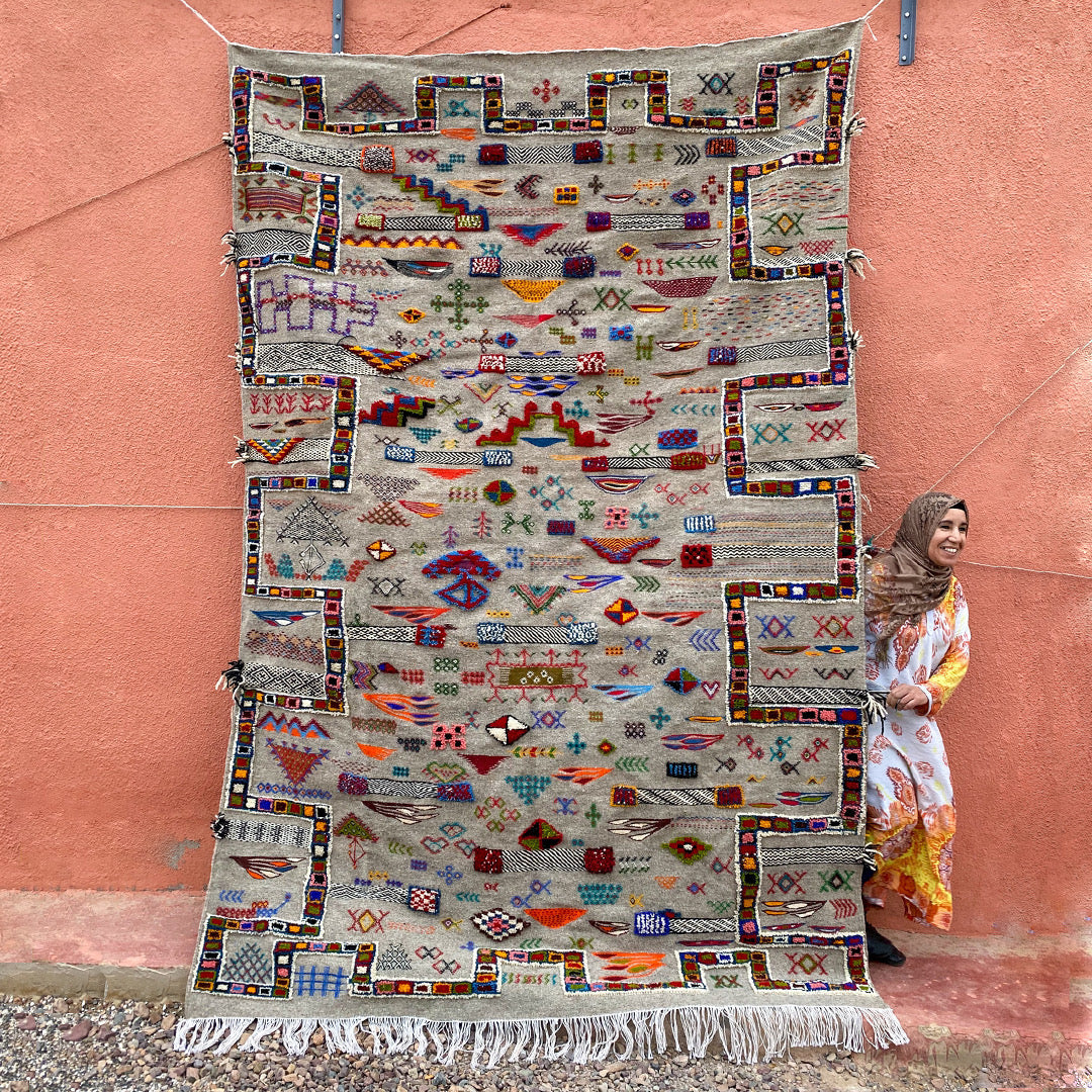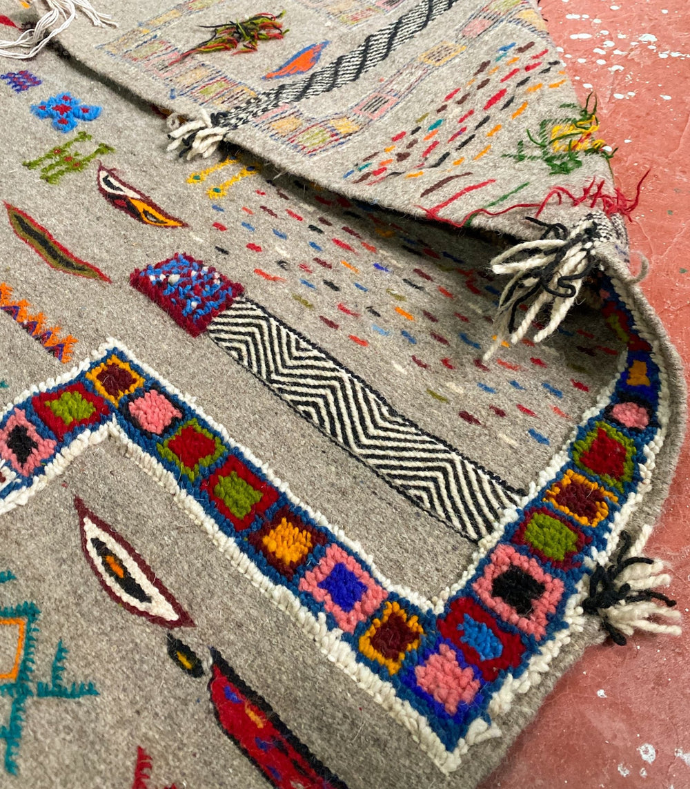 This style is thought to originate from the area in and around the Village of Tazenakht, an area rich with a weaving history. While the majority of this weave is flat, the design accents are either embroidered or have a slightly higher pile, giving this piece texture and dimension. Every design element comes entirely from the artisan’s imagination. The design elements within this technique tend to depict an array of symbolism in the Amazigh culture.