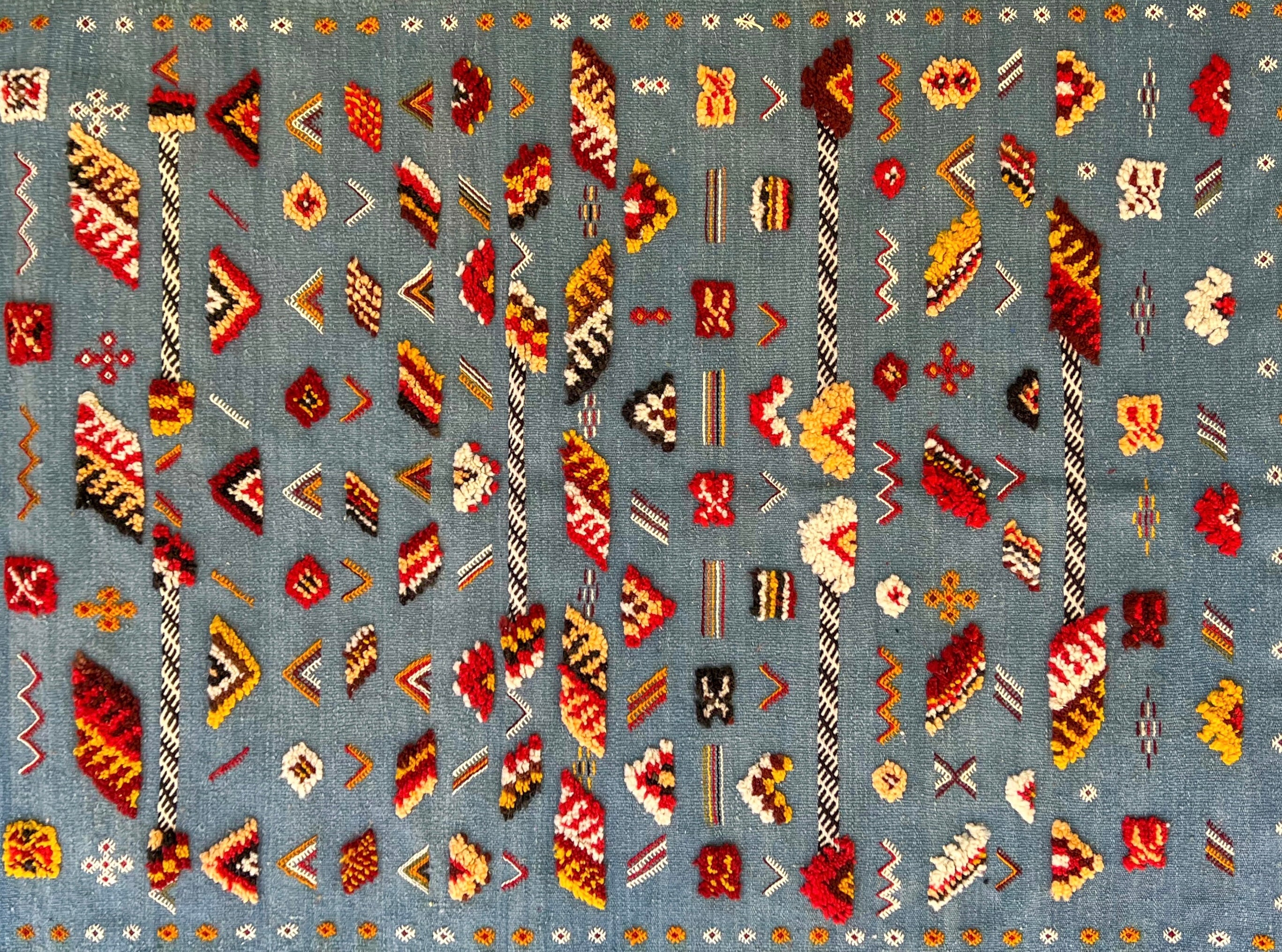This style is thought to originate from the area in and around the Village of Tazenakht, an area rich with a weaving history. While the majority of this weave is flat, the design accents are either embroidered or have a slightly higher pile, giving this piece texture and dimension. Every design element comes entirely from the artisan’s imagination. The design elements within this technique tend to depict an array of symbolism in the Amazigh culture.