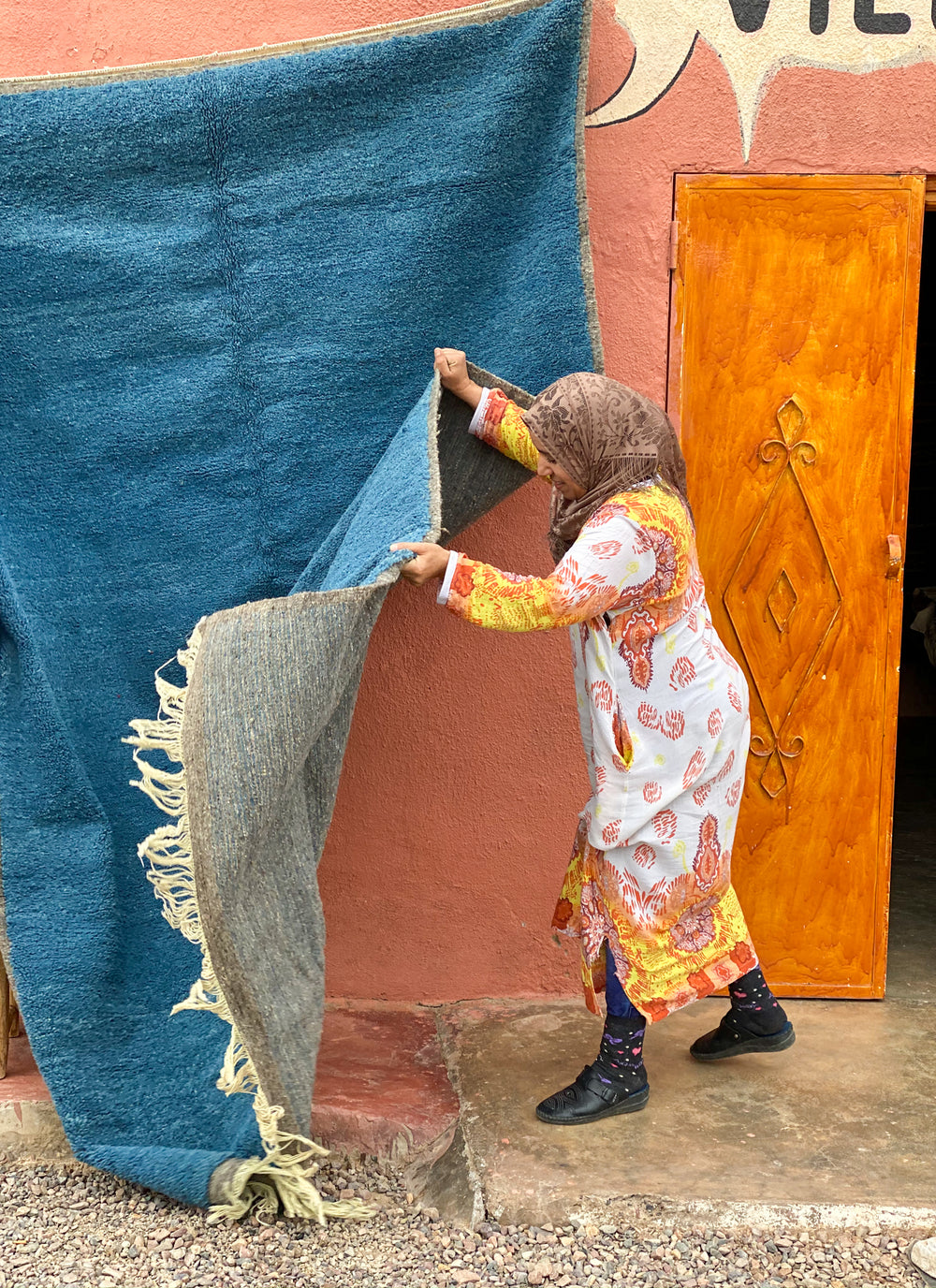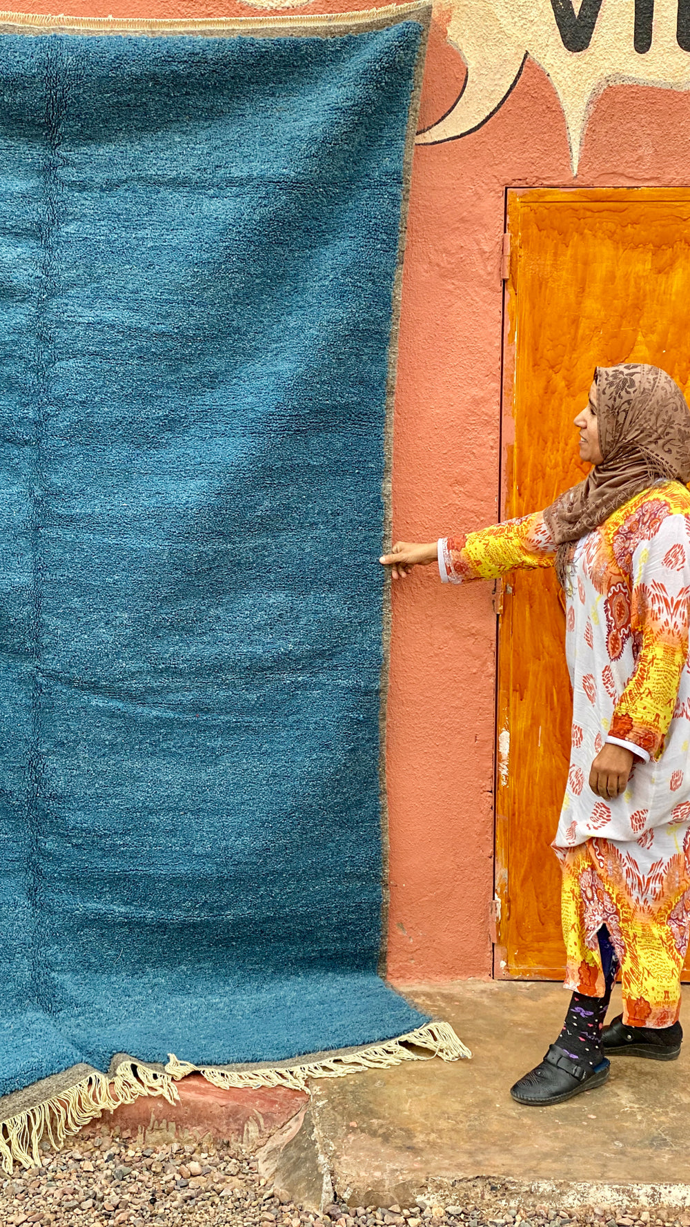 The Association Le Vieux Village is a beautiful collective of women artisans just outside of Tazenakht. This Association is a true family affair. Mlouka, the matriarch of the collective, has passed the art of weaving down to her daughters, Naima and Fatima, daughters-in-law, Latifa and Meriem, cousins, and villagers. All of the rugs from Le Vieux are made from 100% live wool that was brushed, carded, and hand-spun by the women of the Association.
