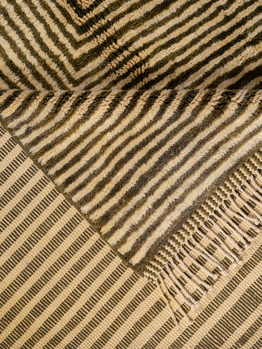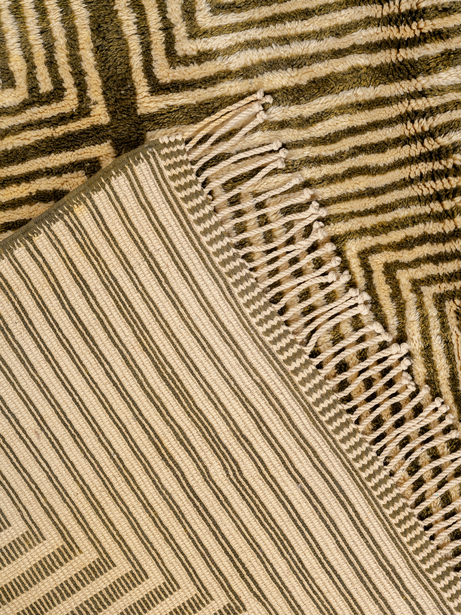 Soukina leads a group of 35 artisans from a village just outside Beni M’rirt in the Middle Atlas Mountains. Founded in the early 2000s by Soukina’s late mother, Ketlouma, the collective specializes in medium to high hand-knot rugs—a style named after the region—as well as M’rirt Zanafi rugs, their unique interpretation of the Zanafi style from the southeast. Traditional rugs from this area are crafted using a thick knotting technique, resulting in an extra-plush texture.