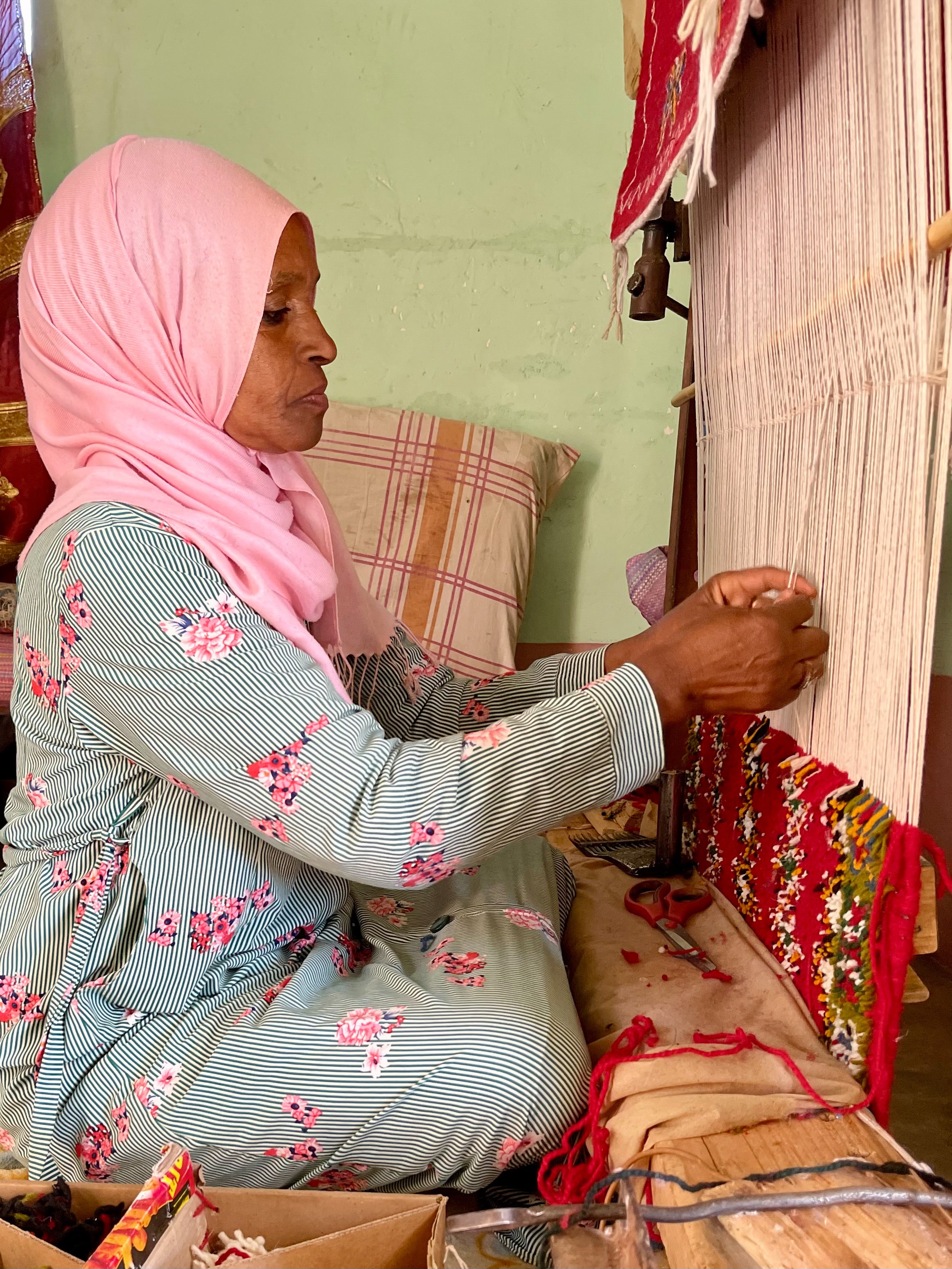 Our process is different, as we work directly with the women selling these heirloom rug pieces. We visit their homes and neighborhoods to see the pieces in-person and negotiate face-to-face.