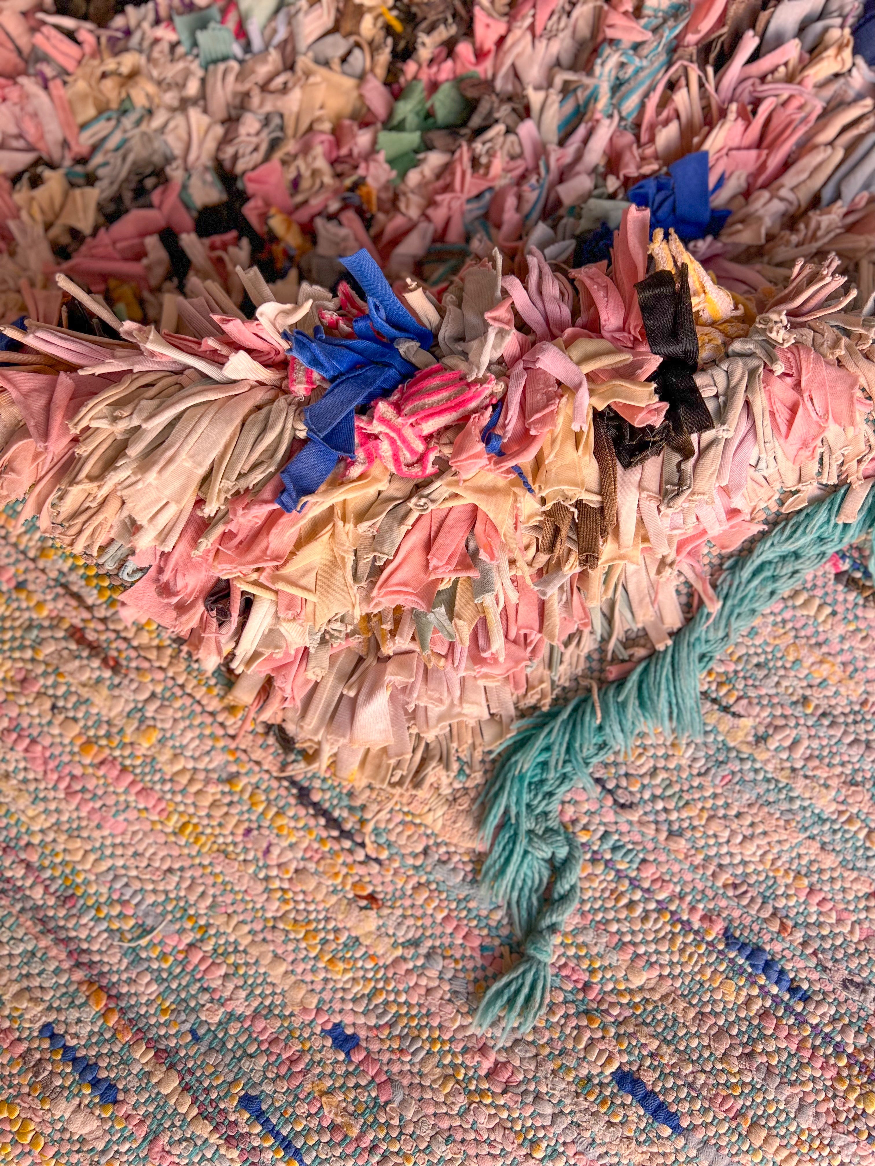 This rug technique is called Boucherouite (pronounced boo-shay-reet). These pieces are made from yarn, recycled clothing, or even textile scraps. Boucherouite rugs are often used in weavers’ own homes. In fact, this style of rug wasn’t traditionally sold but their vibrant, playful nature has made them popular.