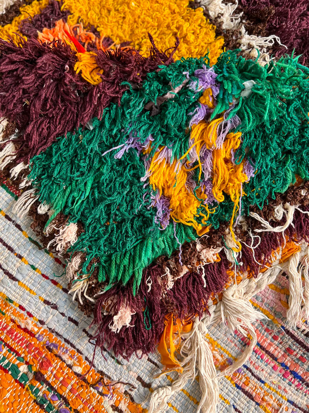 This rug technique is called Boucherouite (pronounced boo-shay-reet). These pieces are made from yarn, recycled clothing, or even textile scraps. Boucherouite rugs are often used in weavers’ own homes. In fact, this style of rug wasn’t traditionally sold but their vibrant, playful nature has made them popular.