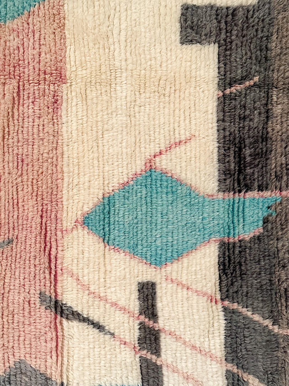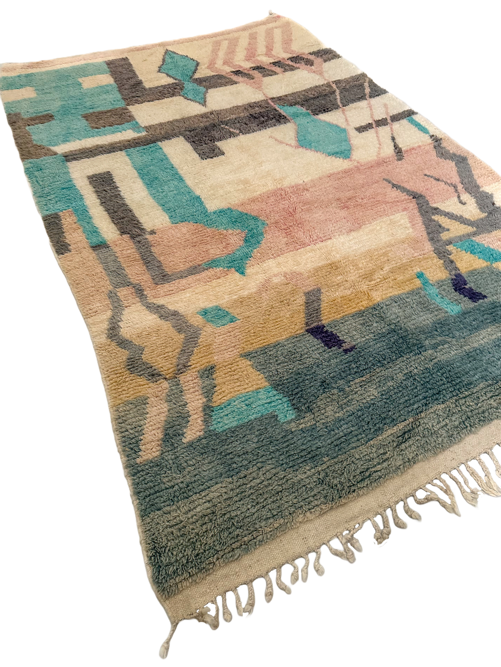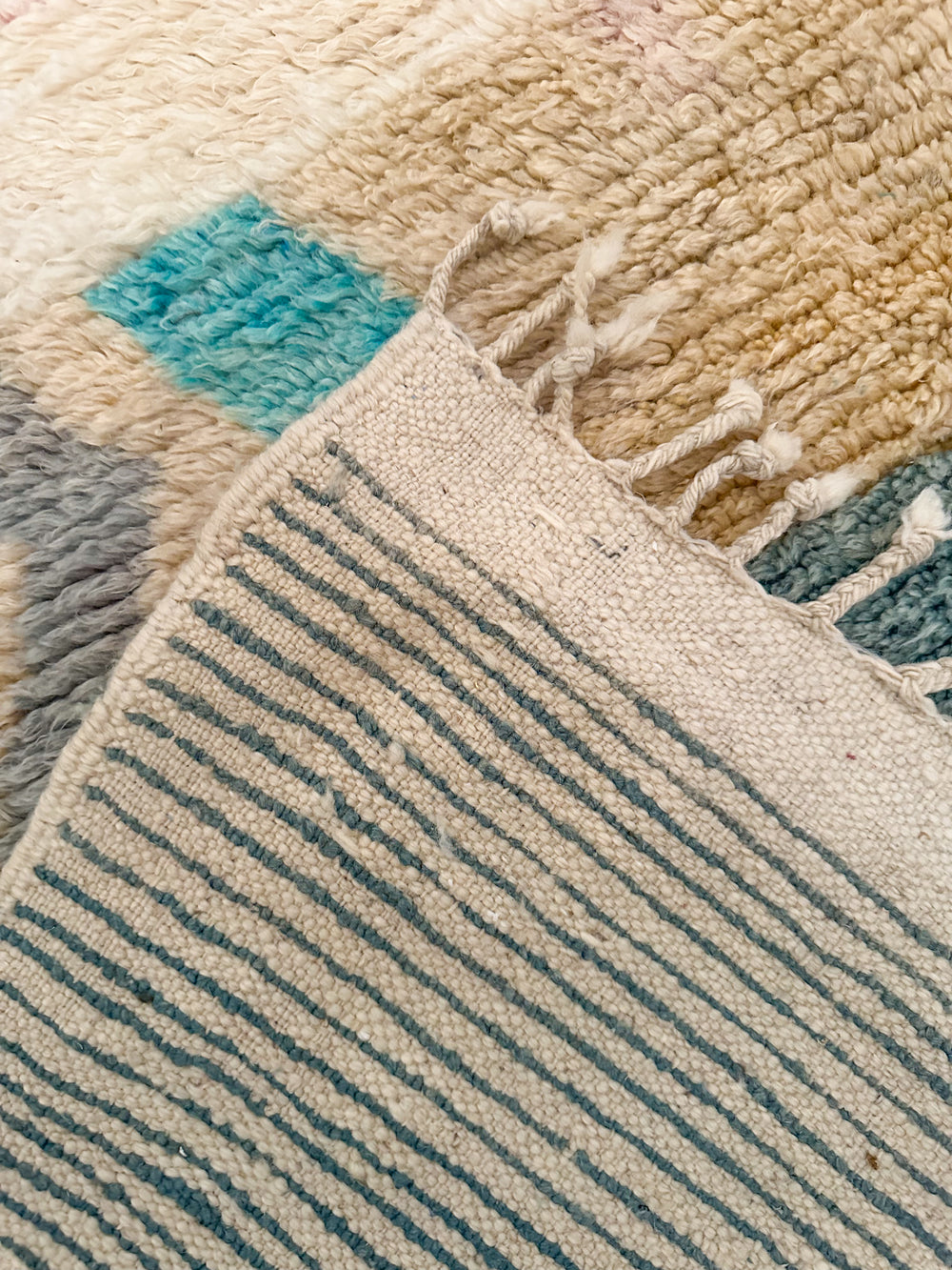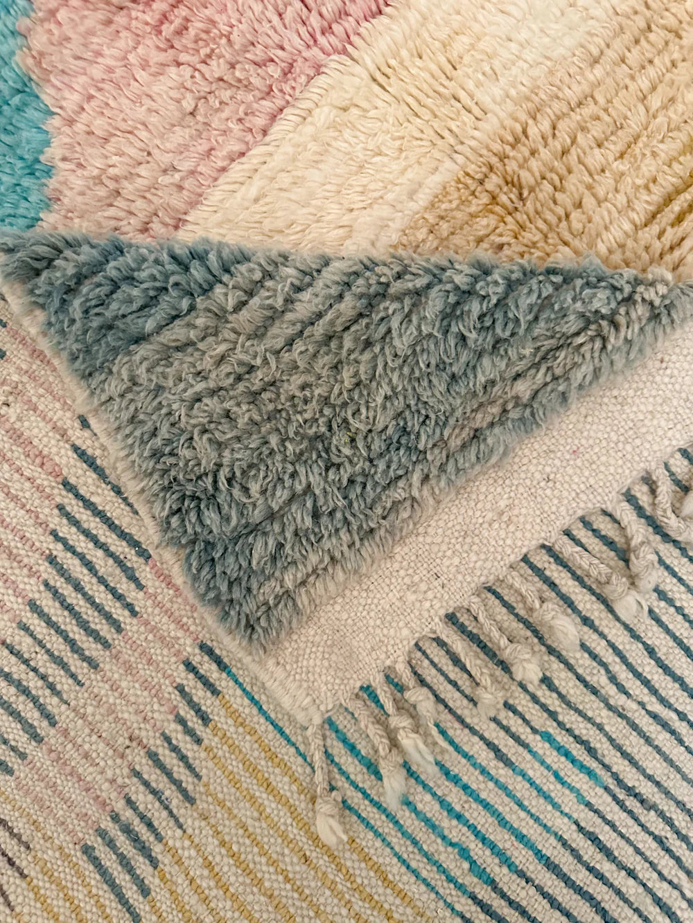 Boujad rugs originate from the Al Haouz region of Morocco and are celebrated for their distinctive and vibrant aesthetic. These rugs often showcase a myriad of bold colors. One of the defining features of Boujad rugs is their use of geometric shapes, abstract forms, and symbolic motifs passed down through generations, each telling a story of the weaver's cultural heritage and artistic expression. The weaving technique results in a less dense pile compared to other Moroccan rugs, giving them a distinct texture.