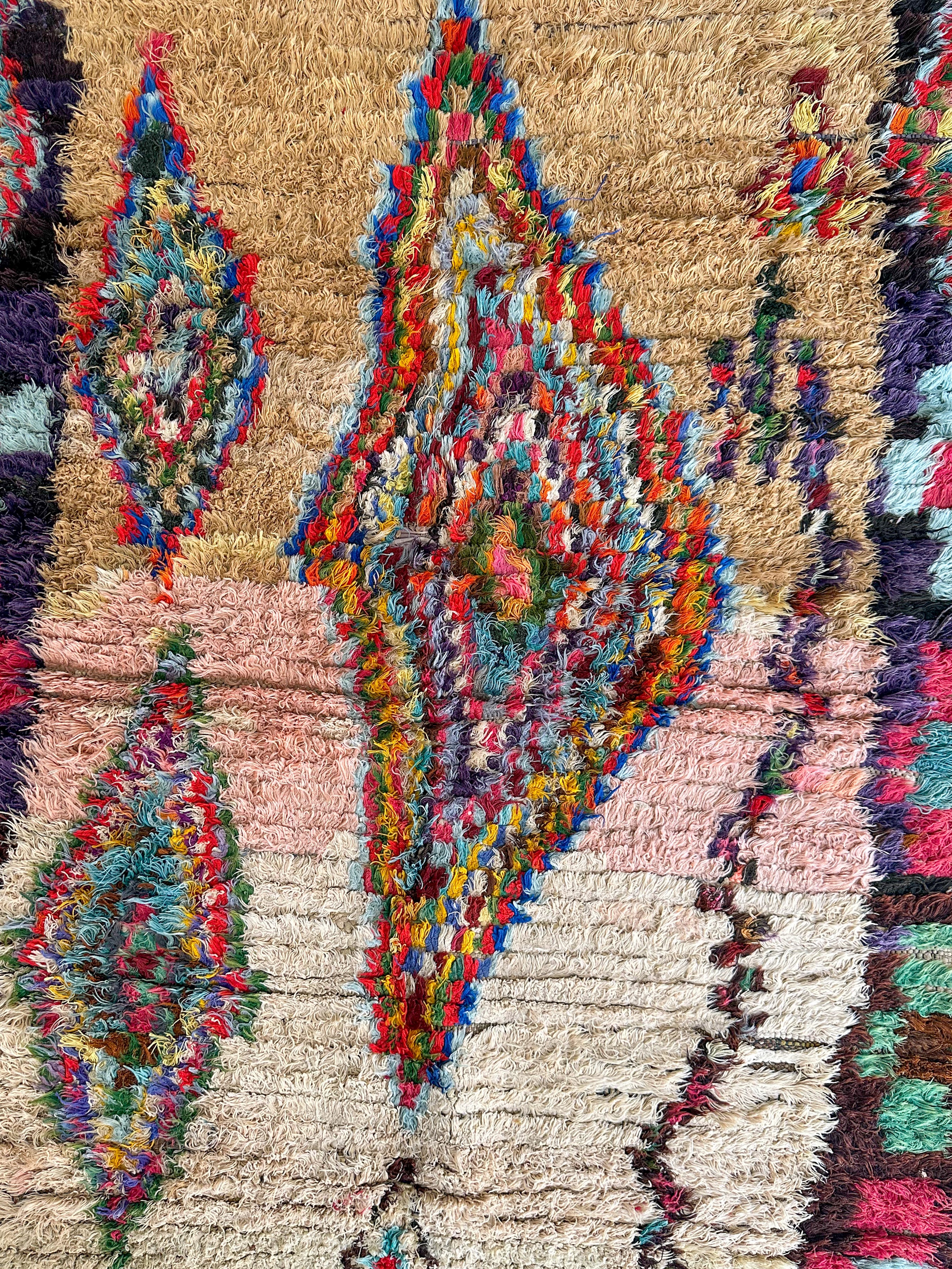 This rug technique is called Boucherouite (pronounced boo-shay-reet). These pieces are made from yarn, recycled clothing, or even textile scraps. Boucherouite rugs are often used in weavers’ own homes. In fact, this style of rug wasn’t traditionally sold but their vibrant, playful nature has made them popular.