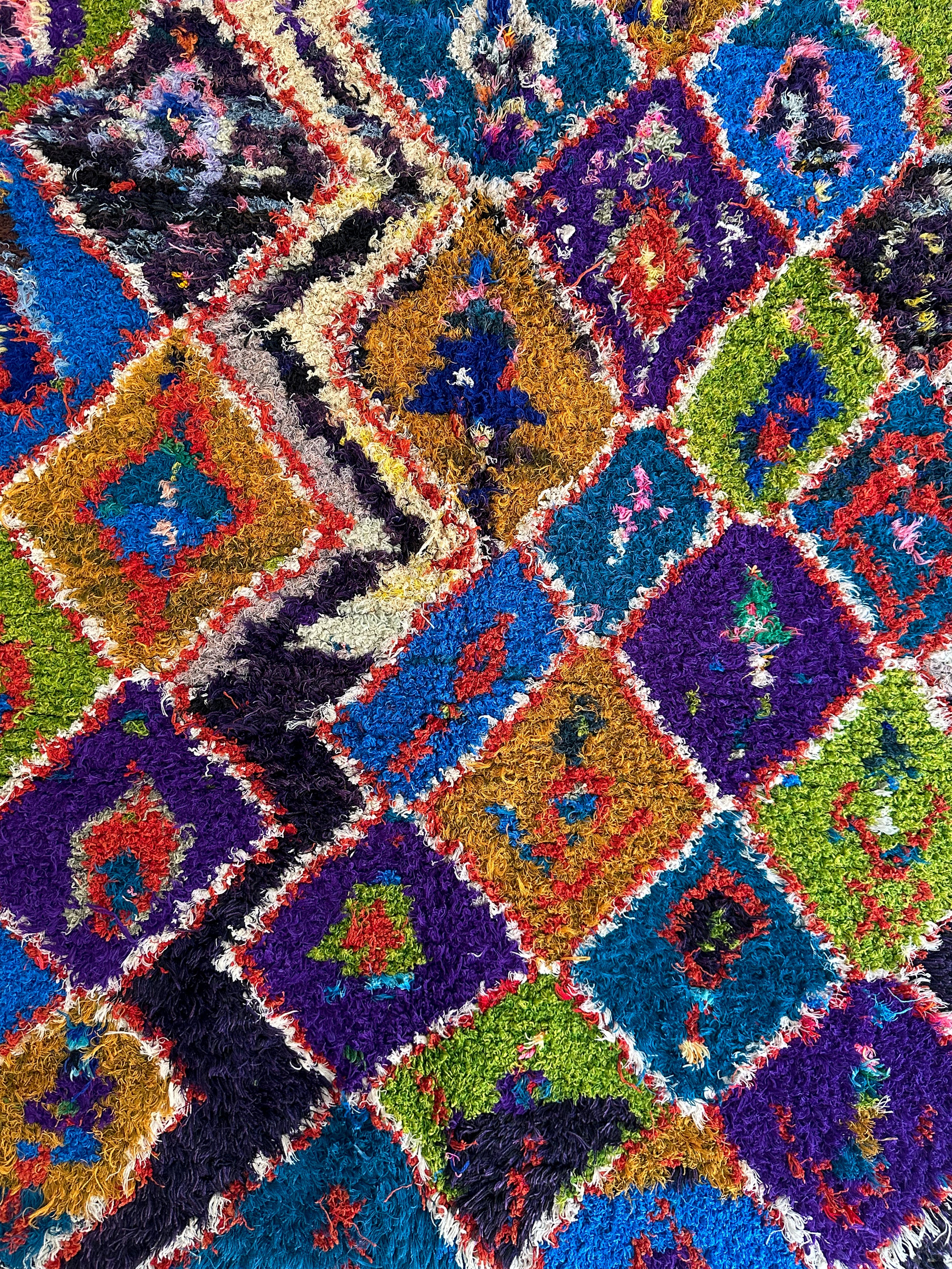 This rug technique is called Boucherouite (pronounced boo-shay-reet). These pieces are made from yarn, recycled clothing, or even textile scraps. Boucherouite rugs are often used in weavers’ own homes. In fact, this style of rug wasn’t traditionally sold but their vibrant, playful nature has made them popular.
