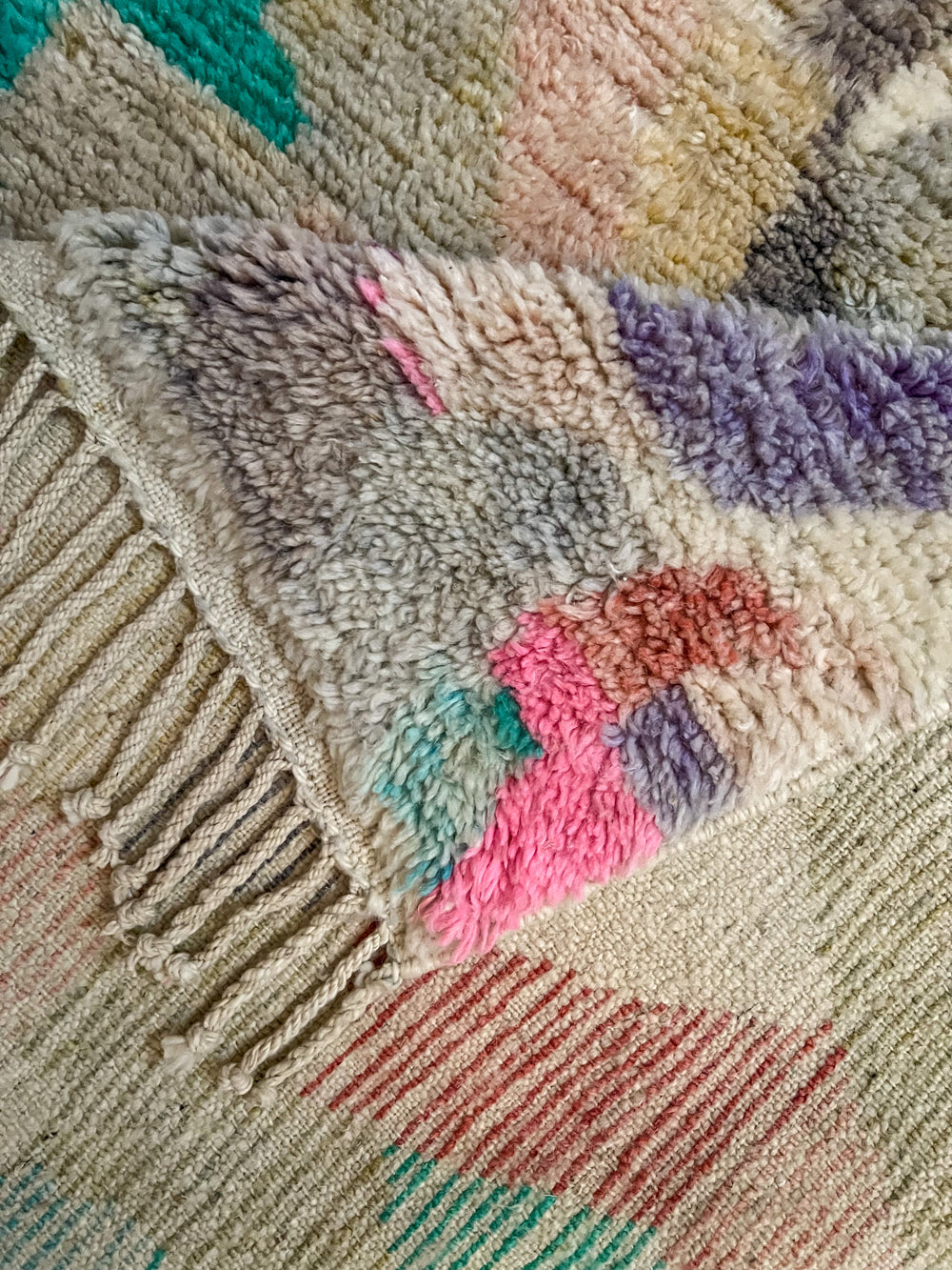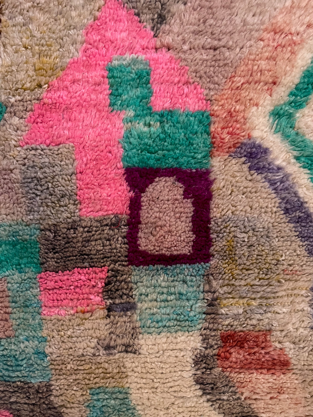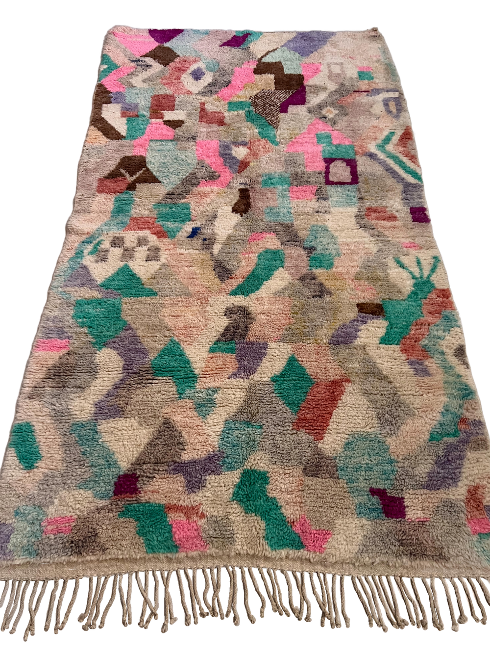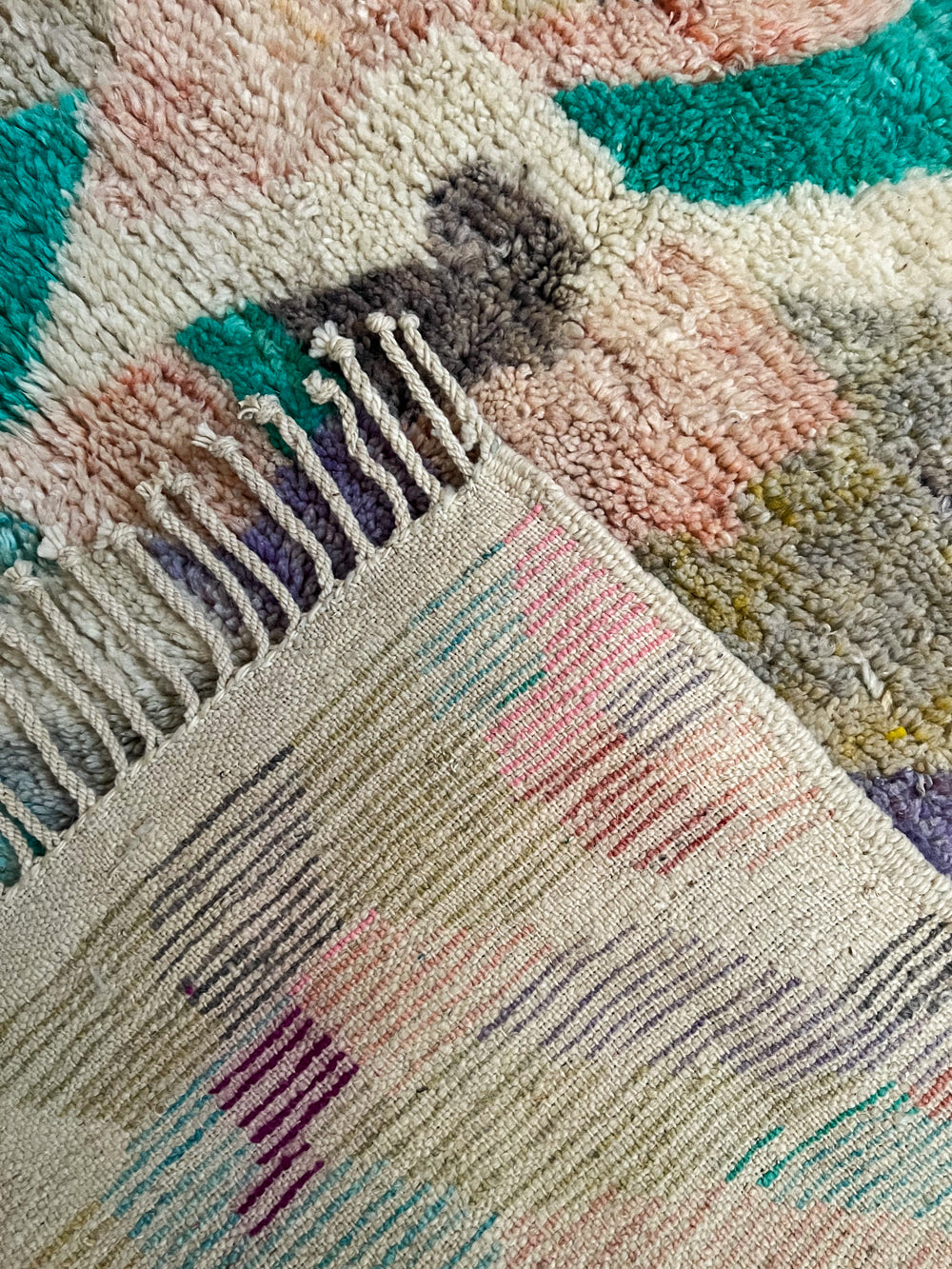 Boujad rugs originate from the Al Haouz region of Morocco and are celebrated for their distinctive and vibrant aesthetic. These rugs often showcase a myriad of bold colors. One of the defining features of Boujad rugs is their use of geometric shapes, abstract forms, and symbolic motifs passed down through generations, each telling a story of the weaver's cultural heritage and artistic expression. The weaving technique results in a less dense pile compared to other Moroccan rugs, giving them a distinct texture.