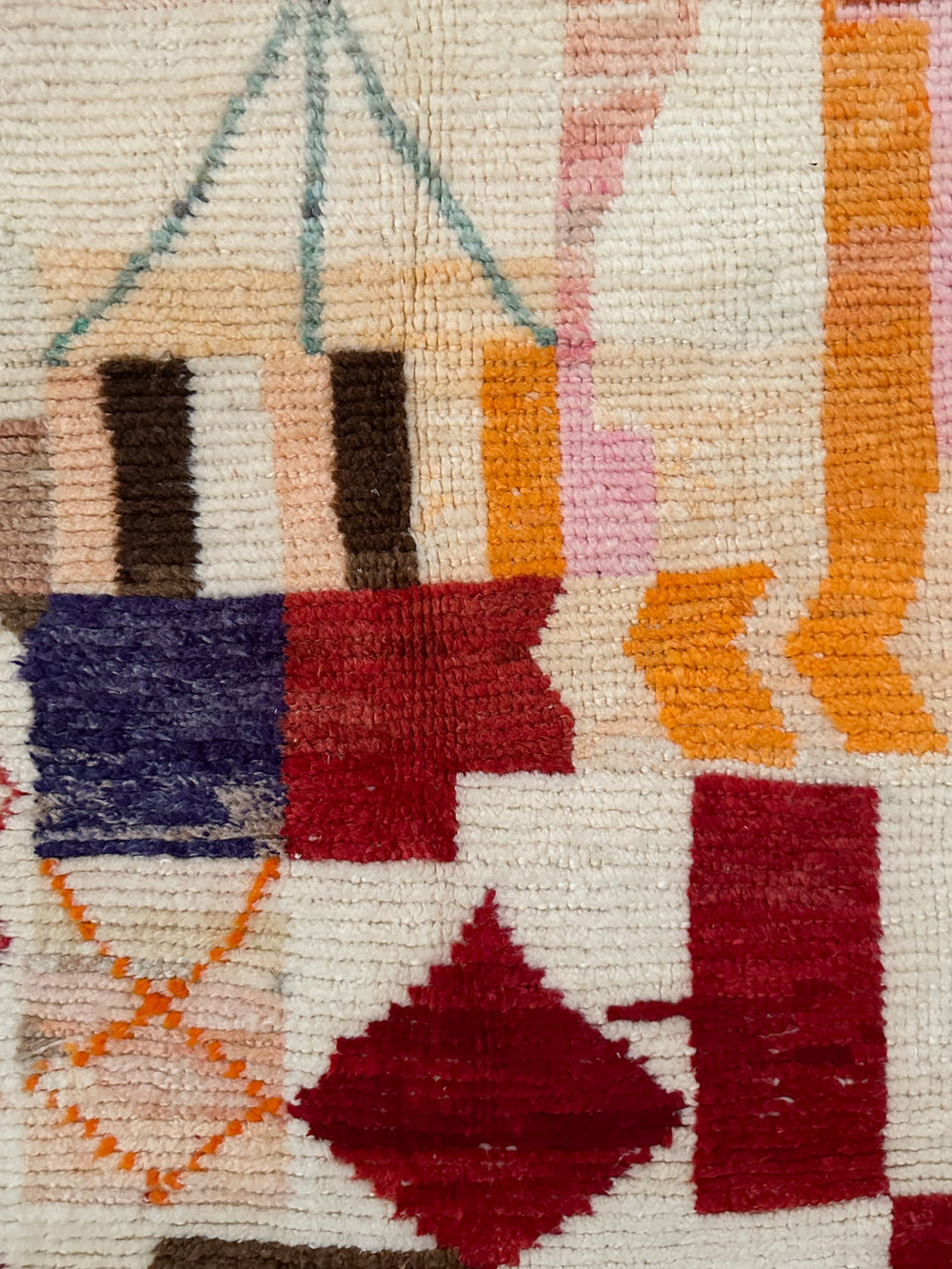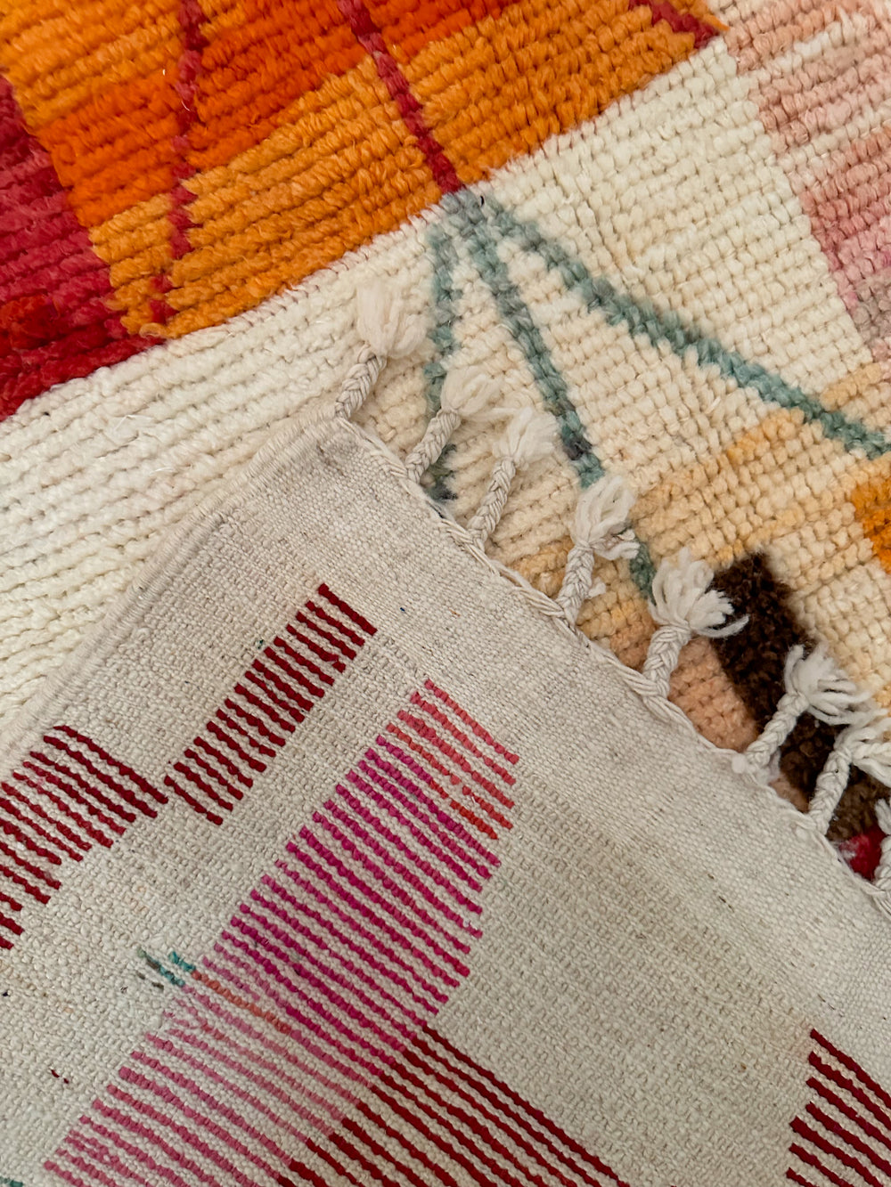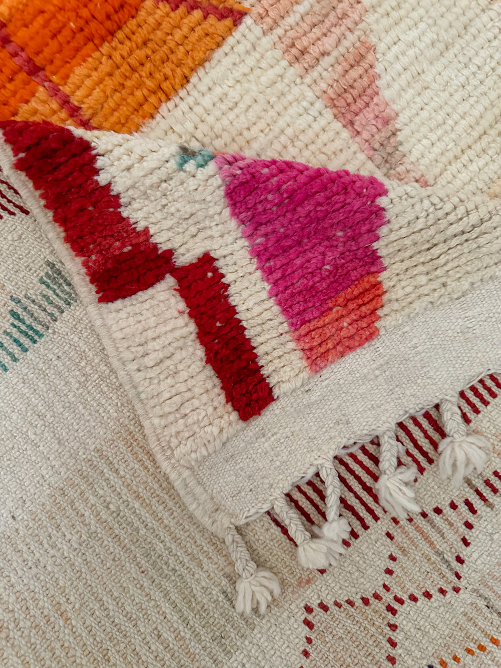 Boujad rugs originate from the Al Haouz region of Morocco and are celebrated for their distinctive and vibrant aesthetic. These rugs often showcase a myriad of bold colors. One of the defining features of Boujad rugs is their use of geometric shapes, abstract forms, and symbolic motifs passed down through generations, each telling a story of the weaver's cultural heritage and artistic expression. The weaving technique results in a less dense pile compared to other Moroccan rugs, giving them a distinct texture.