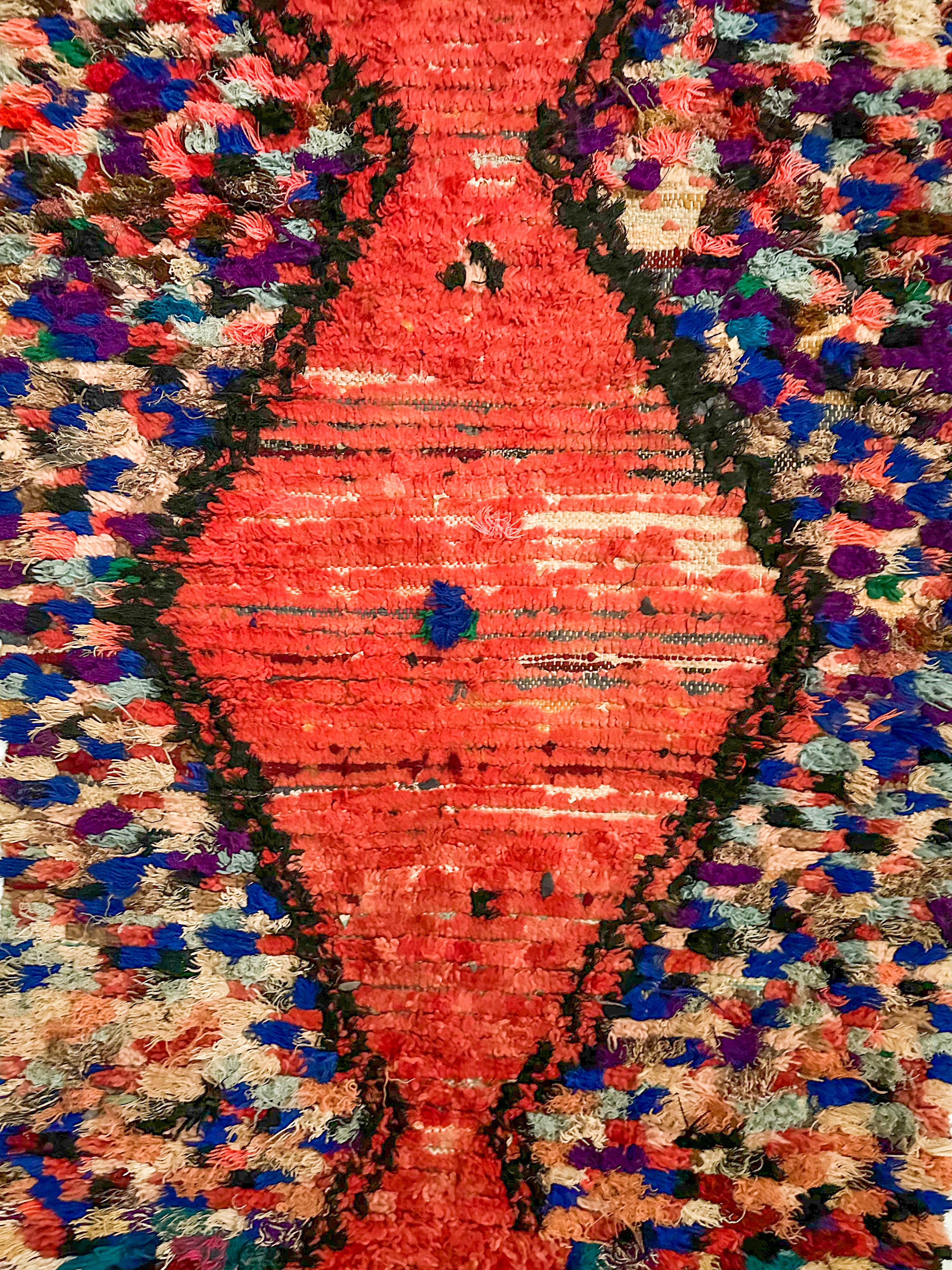 This rug technique is called Boucherouite (pronounced boo-shay-reet). These pieces are made from yarn, recycled clothing, or even textile scraps. Boucherouite rugs are often used in weavers’ own homes. In fact, this style of rug wasn’t traditionally sold but their vibrant, playful nature has made them popular.