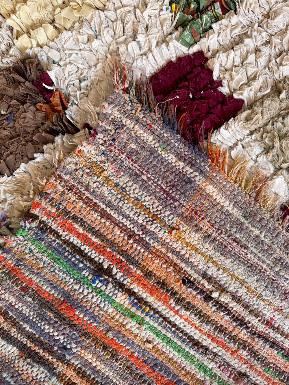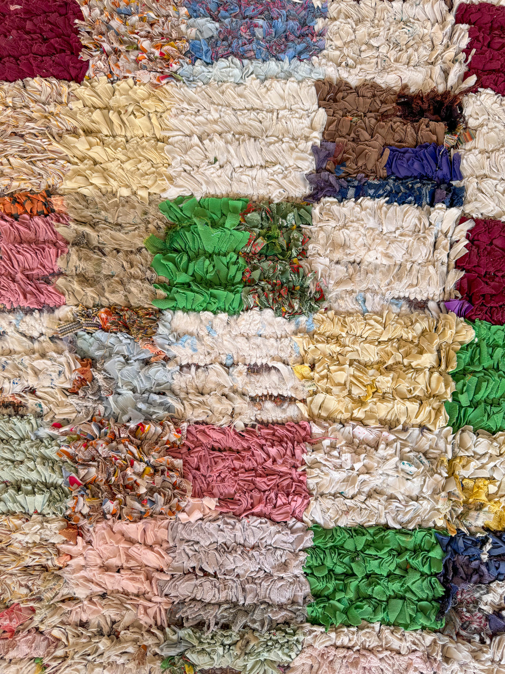 This rug technique is called Boucherouite (pronounced boo-shay-reet). These pieces are made from yarn, recycled clothing, or even textile scraps. Boucherouite rugs are often used in weavers’ own homes. In fact, this style of rug wasn’t traditionally sold but their vibrant, playful nature has made them popular.