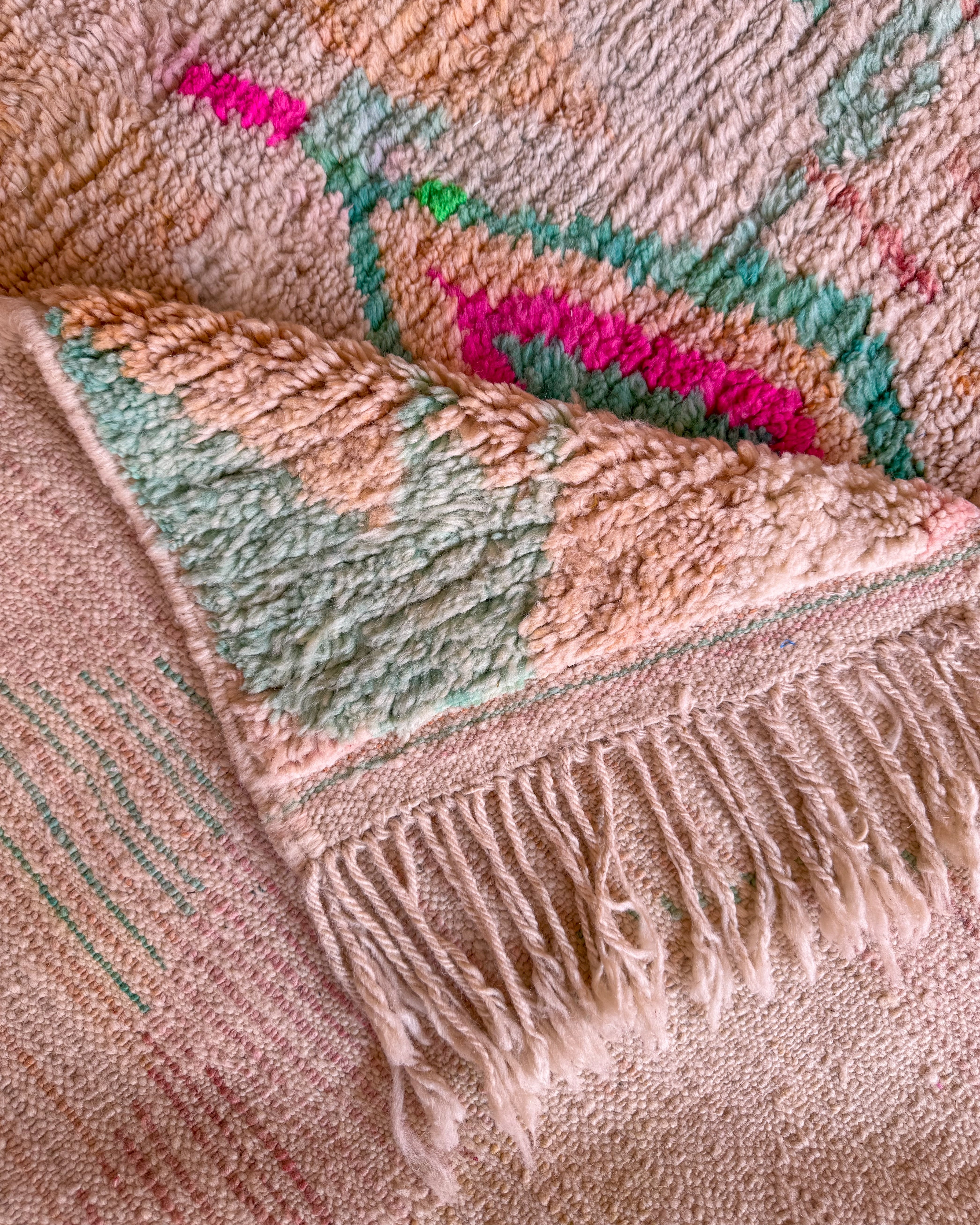 Boujad rugs originate from the Al Haouz region of Morocco and are celebrated for their distinctive and vibrant aesthetic. These rugs often showcase a myriad of bold colors. One of the defining features of Boujad rugs is their use of geometric shapes, abstract forms, and symbolic motifs passed down through generations, each telling a story of the weaver's cultural heritage and artistic expression. The weaving technique results in a less dense pile compared to other Moroccan rugs, giving them a distinct texture.