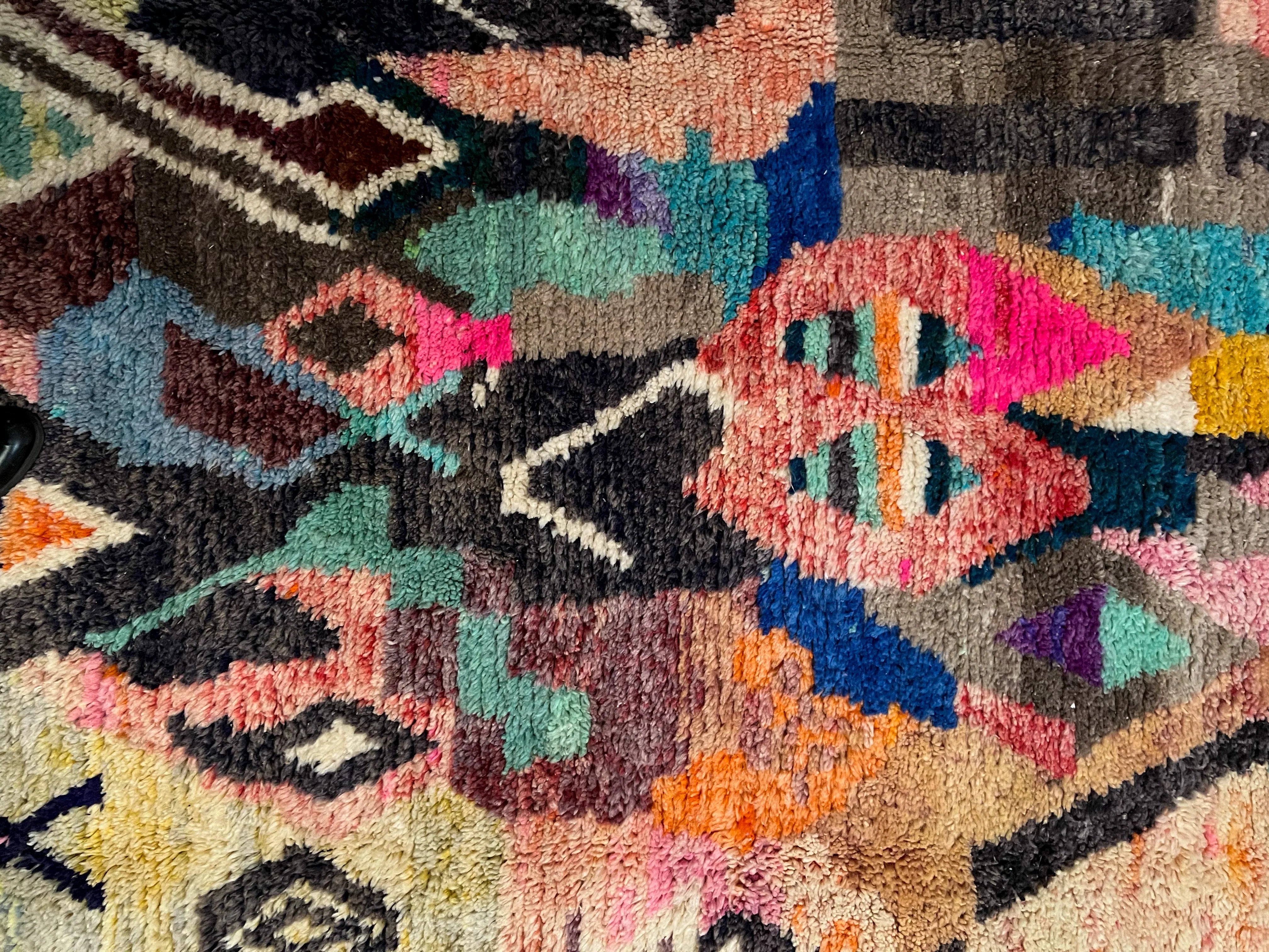 Boujad rugs originate from the Al Haouz region of Morocco and are celebrated for their distinctive and vibrant aesthetic. These rugs often showcase a myriad of bold colors. One of the defining features of Boujad rugs is their use of geometric shapes, abstract forms, and symbolic motifs passed down through generations, each telling a story of the weaver's cultural heritage and artistic expression. The weaving technique results in a less dense pile compared to other Moroccan rugs, giving them a distinct texture.